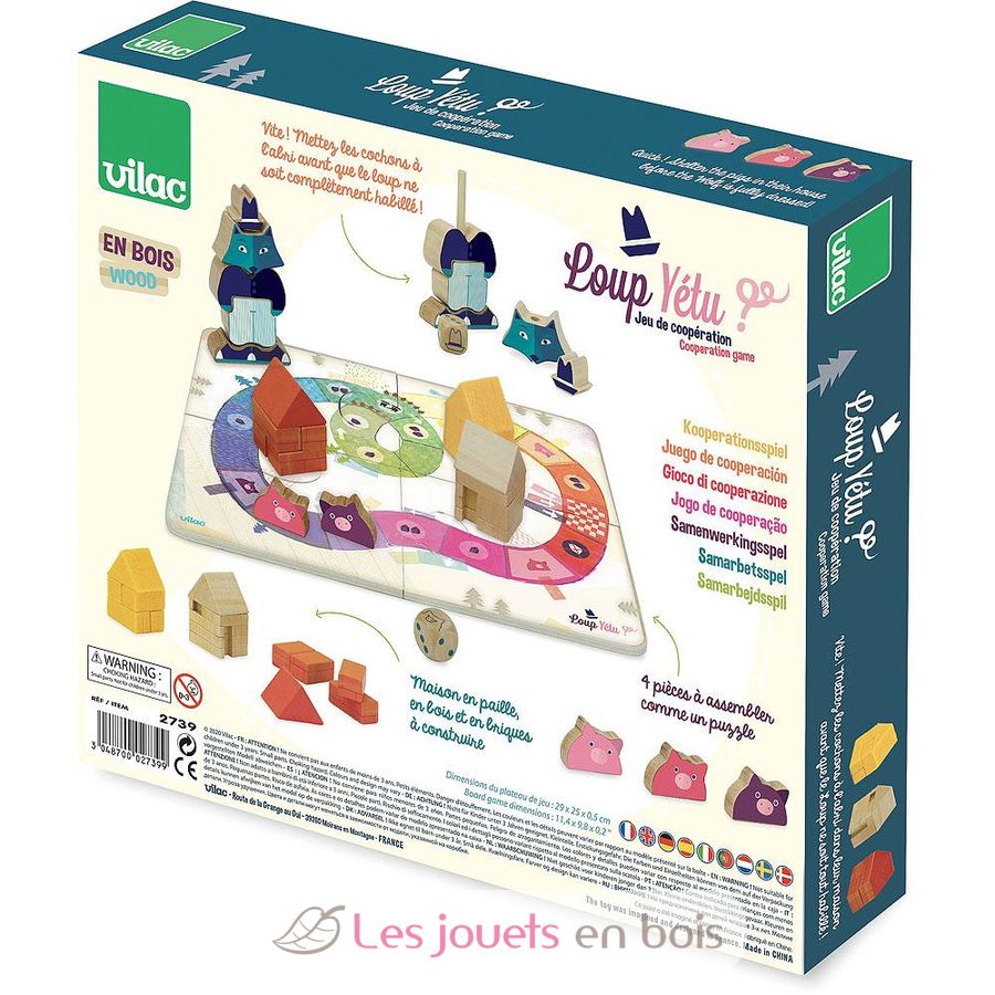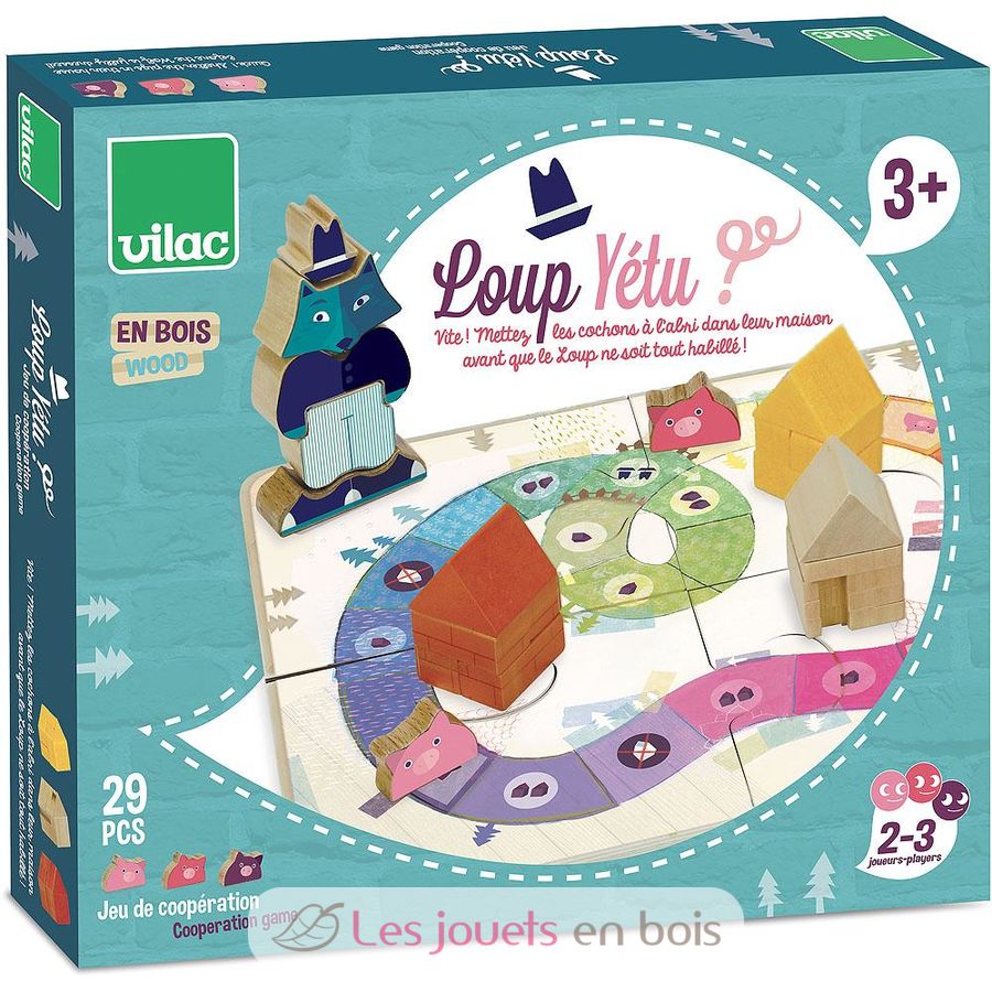 Loup Yétu ? M'entends tu ? Que fais-tu ? S'inspirant de la célèbre comptine du XVIIIème siècle et de l'histoire des 3 petits cochons, Vilac vous propose ce jeu de société original adapté pour les petits à partir de 3 ans.