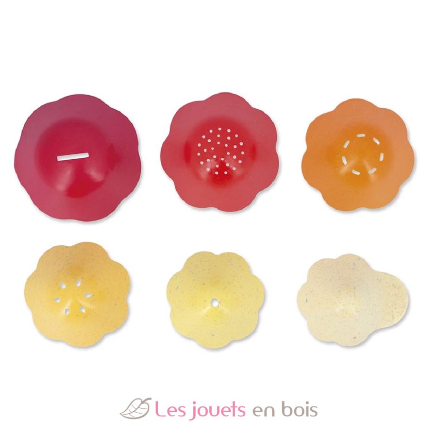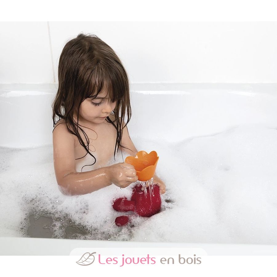 Composé d’une éponge de bain et de 6 coupelles colorées, ce jeu de bain propose plusieurs manières de jouer : les enfants peuvent s’amuser à empiler toutes les coupelles de la plus grande à la plus petite sur la tête de Bernard pour reconstituer sa coquille, mais aussi faire couler l’eau au travers des diverses ouvertures des gobelets. Ils proposent chacun des trous différents pour toujours plus de surprises, et pour arroser Bernard ! L’un d’eux est d’ailleurs une petite louche avec un manche pour jouer à transvaser.