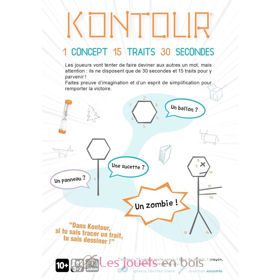 Les joueurs vont tenter de faire deviner aux autres un mot, mais attention : ils ne disposent que de 30 secondes et 15 traits pour y parvenir ! Faites preuve d’imagination et d’un esprit de simplification pour remporter la victoire.