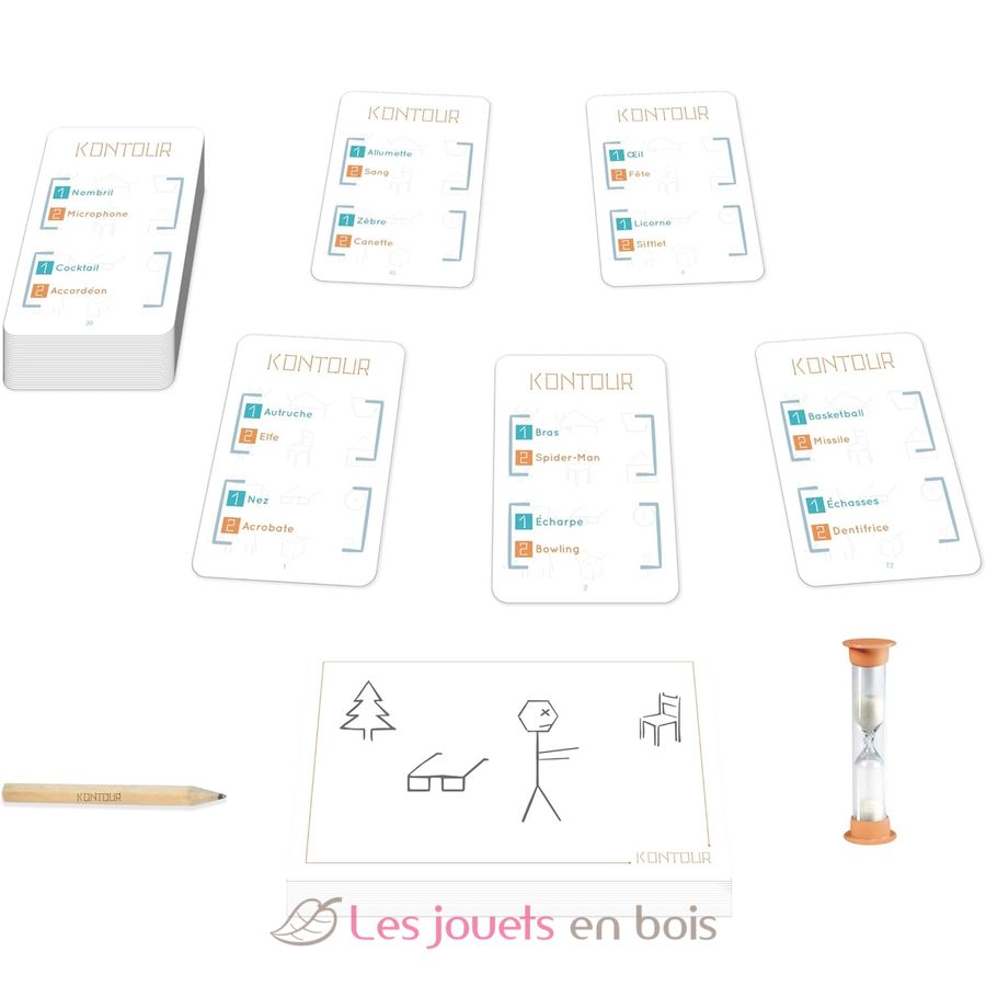 Contenu : 72 cartes, 1 bloc de dessin, 1 crayon, 1 sablier, règle du jeu.