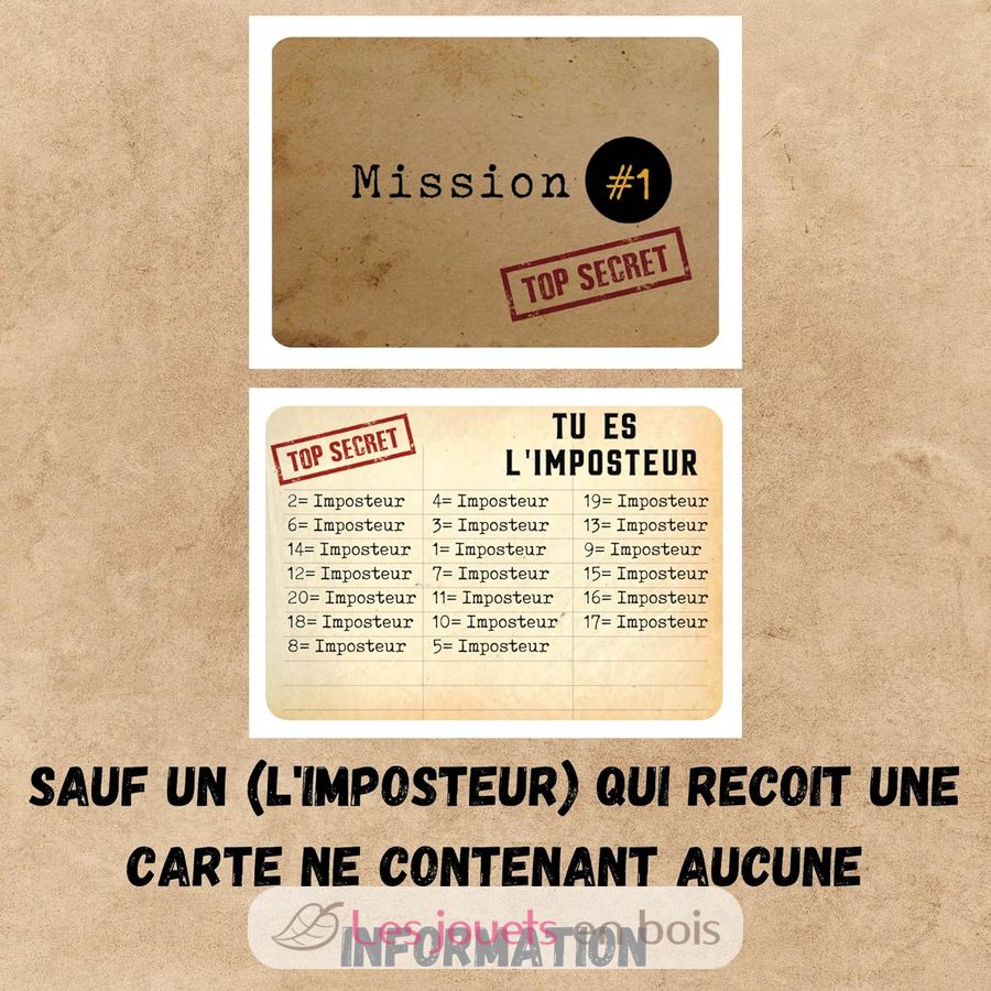 L'Imposteur est un jeu captivant d'association de mots, de bluff et de suspicion. Chaque joueur connaît un mot secret sauf l’Imposteur, qui doit deviner ce mot en s’appuyant sur les indices fournis par les autres joueurs sans se faire démasquer. La partie s'achève lorsque l'Imposteur est identifié ou échappe à la détection, et peut se prolonger sur plusieurs manches.