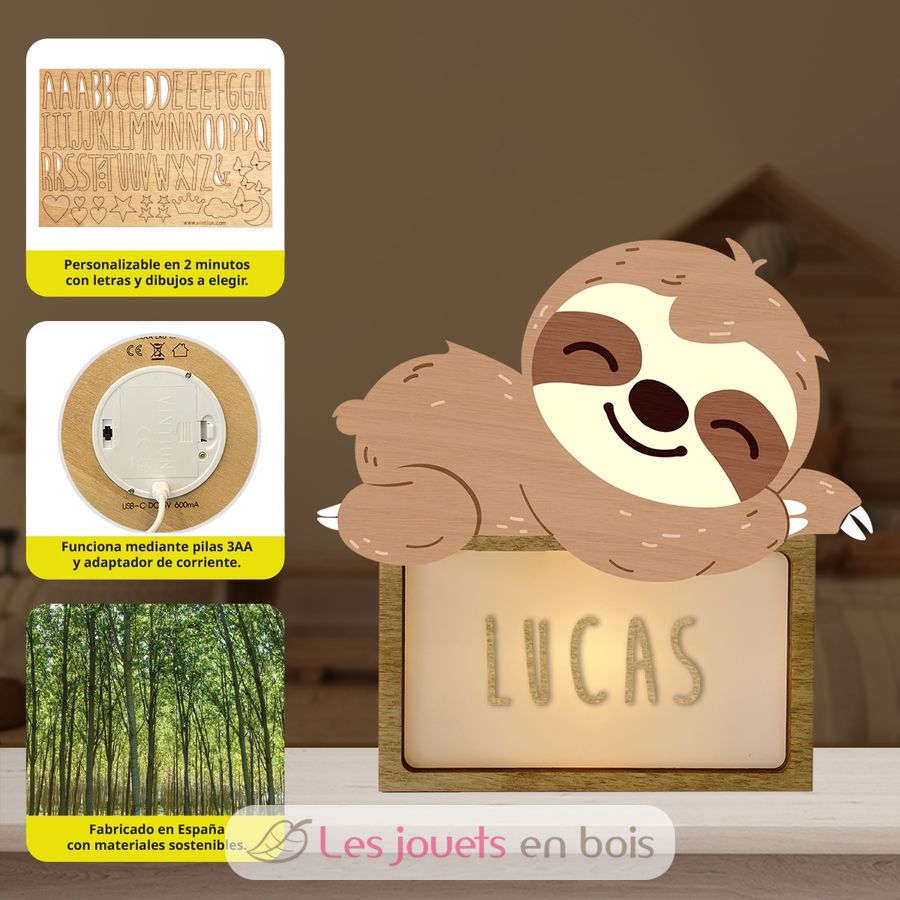 Le kit comprend : 1 lampe en bois et méthacrylate avec éclairage LED ; 1 planche de lettres et symboles en bois autocollants. Dimensions : 16,7 x 16,9 x 6 cm. Zone personnalisable : 11 x 6 cm.