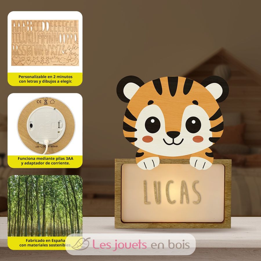 Fabriquée artisanalement dans un atelier de découpe de bois en Espagne, cette petite lampe à poser se personnalise facilement grâce aux lettres et symboles en bois qui l'accompagnent et apporte une touche délicate à la décoration d'une chambre d'enfant. Le bois de peuplier utilisé pour sa fabrication provient de forêt gérées durablement.