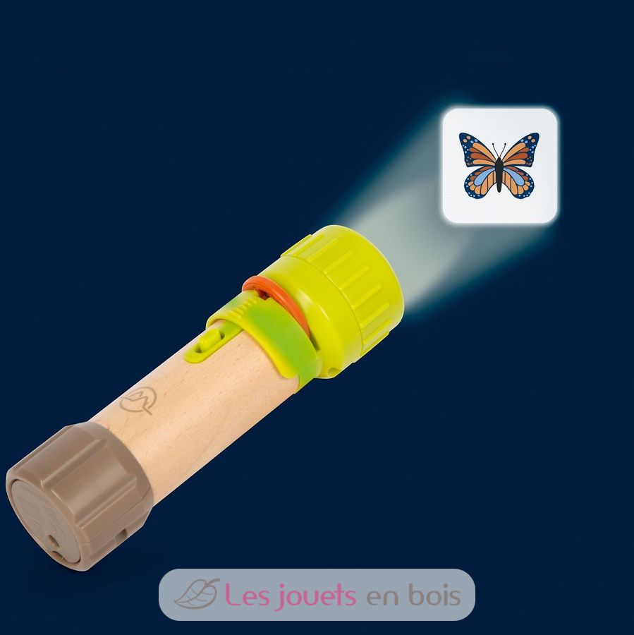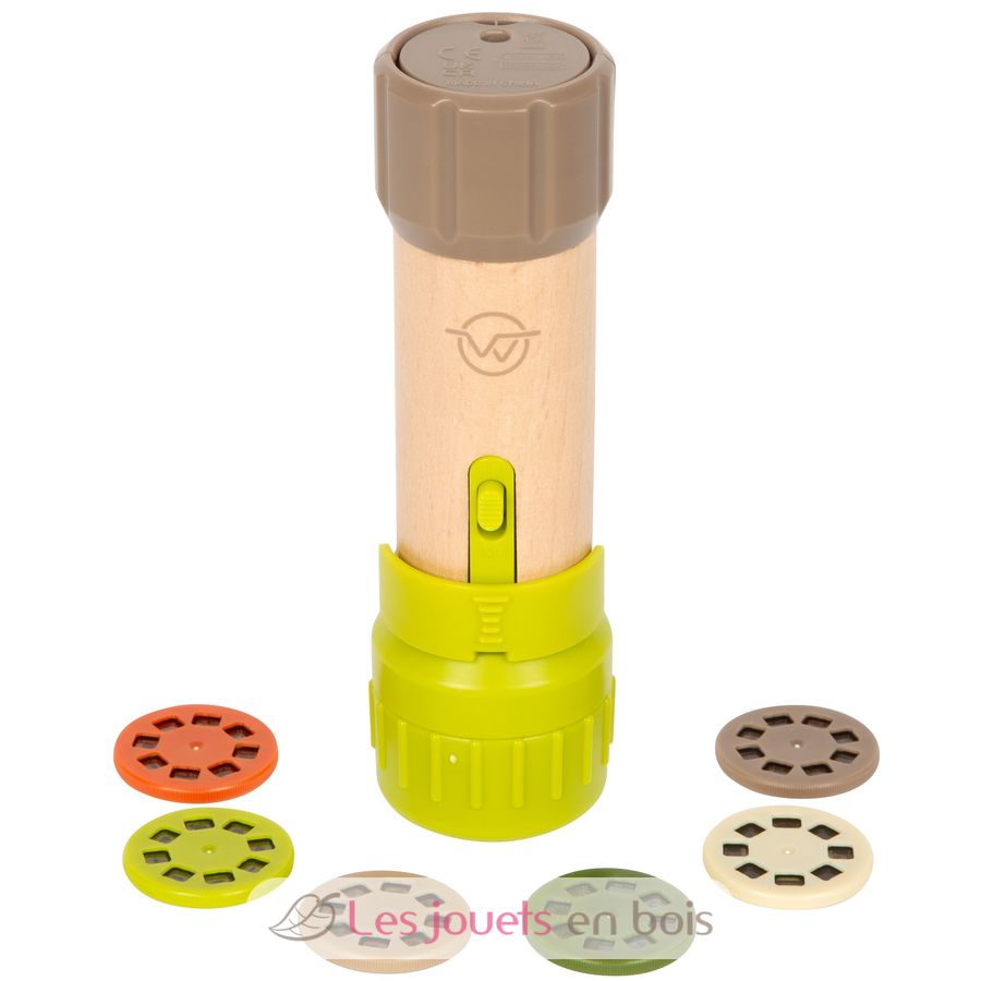 Cette lampe de poche au format ergonomique adaptée aux enfants, en plastique robuste et avec un manche en bois naturel, unie un concentré de savoir : six roues interchangeables présentent différents thèmes scientifiques tels que le cycle de vie de la grenouille, du papillon et du pissenlit, les feuilles et les fruits des arbres, les animaux et leurs empreintes ainsi que les constellations d’étoiles. Parfait pour les petits naturalistes !