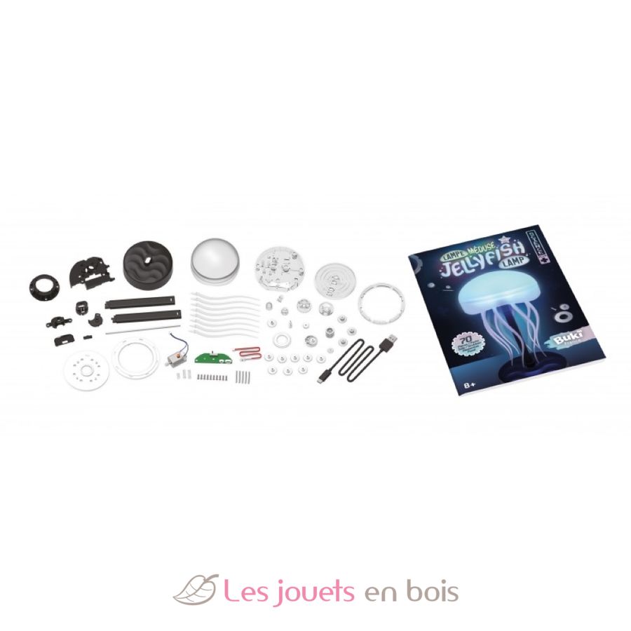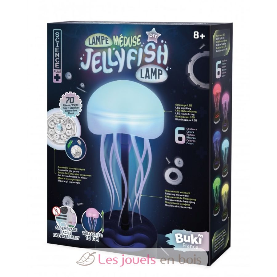 Construis une lampe méduse en assemblant les pièces et les engrenages. La lampe s’illumine avec 6 combinaisons de couleurs différentes qui peuvent changer automatiquement.