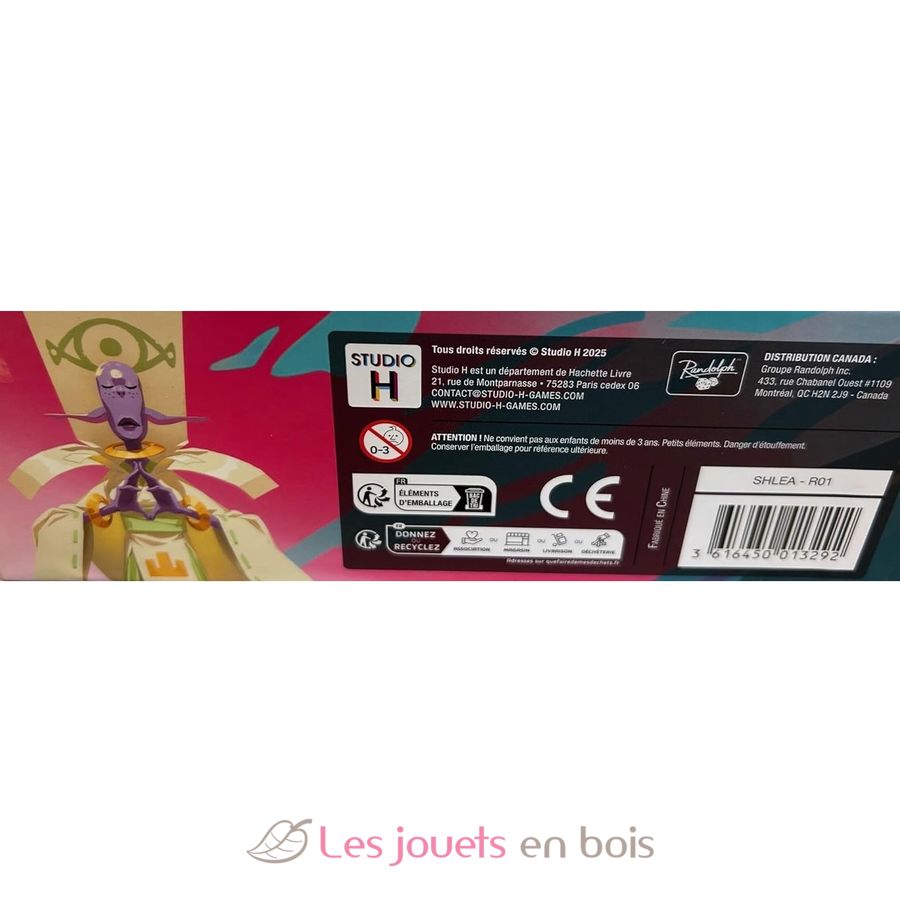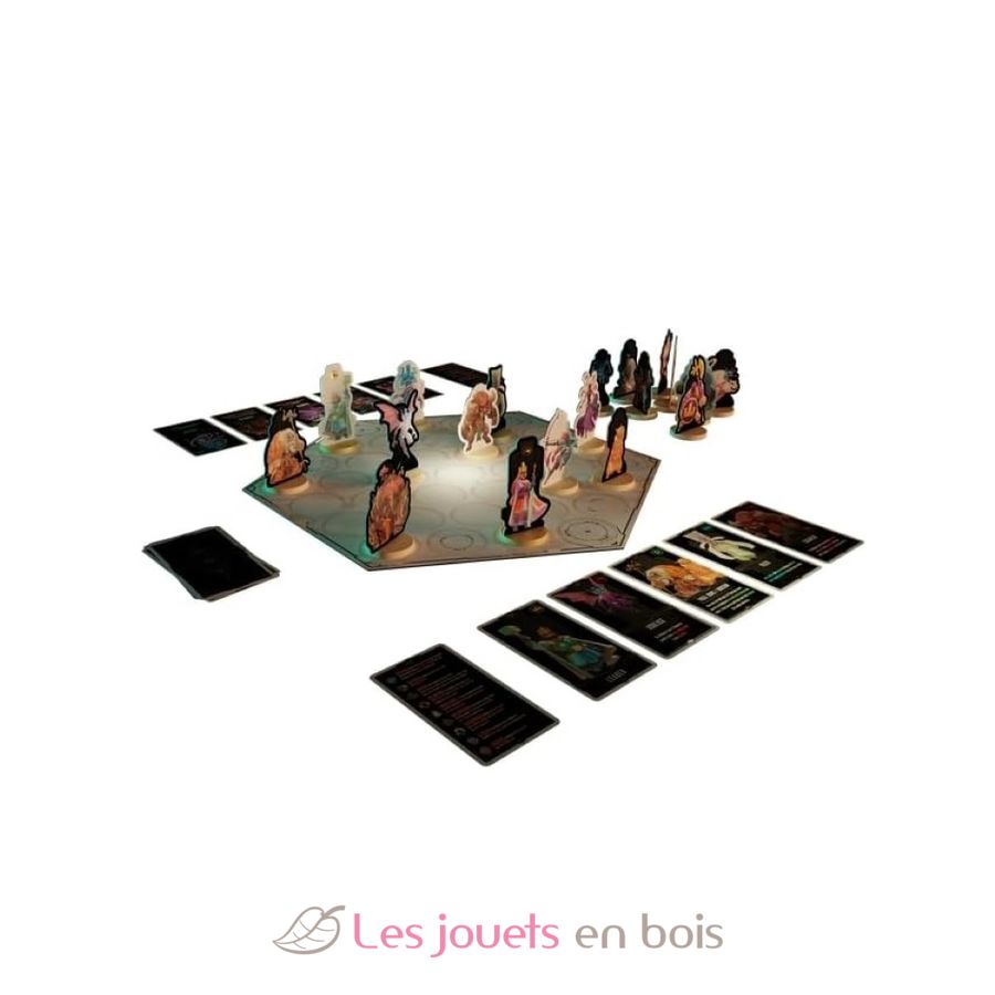 Contenu : 1 plateau de jeu, 19 Personnages avec leurs socles en bois, 18 cartes Personnages, 2 cartes Aide de jeu, la règle du jeu.