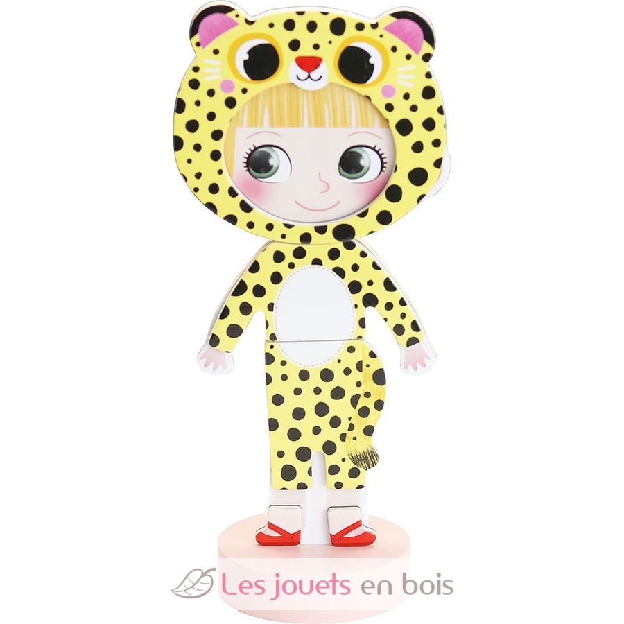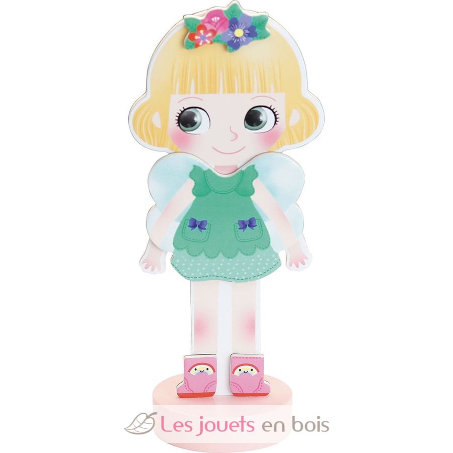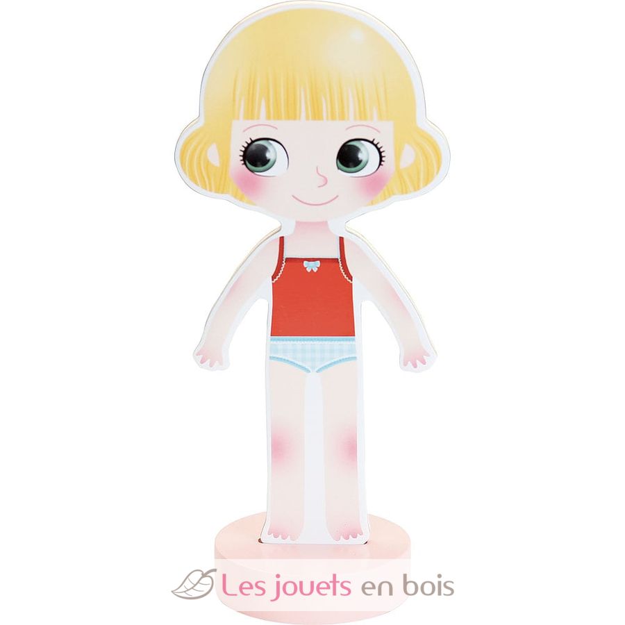 Ce jeu comprend une poupée en bois magnétique de 22 cm de haut et 36 vêtements et accessoires en bois pour l'habiller.