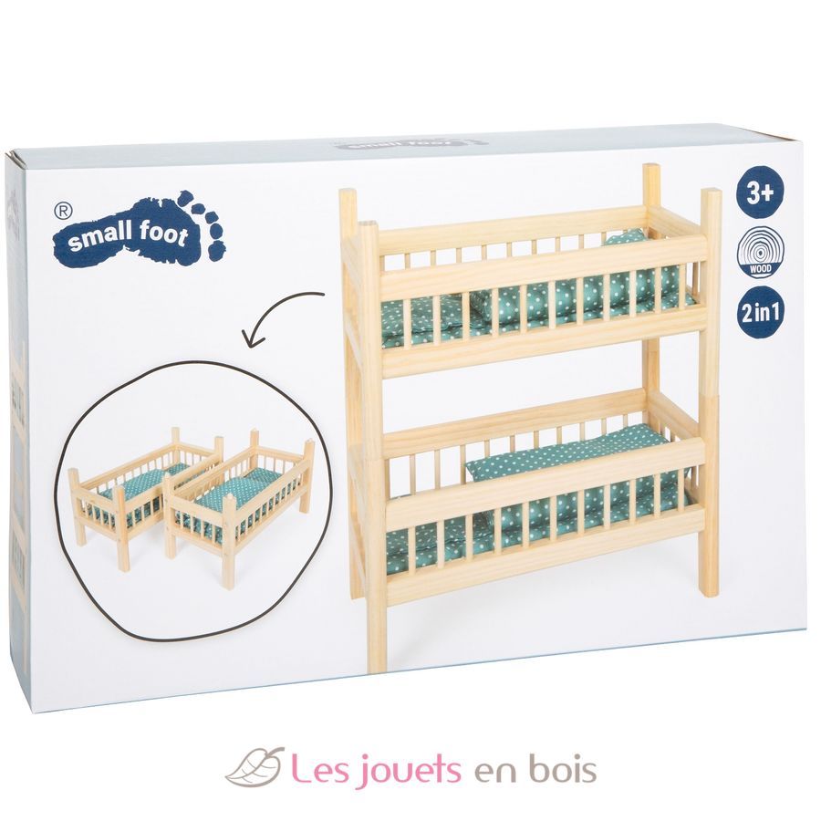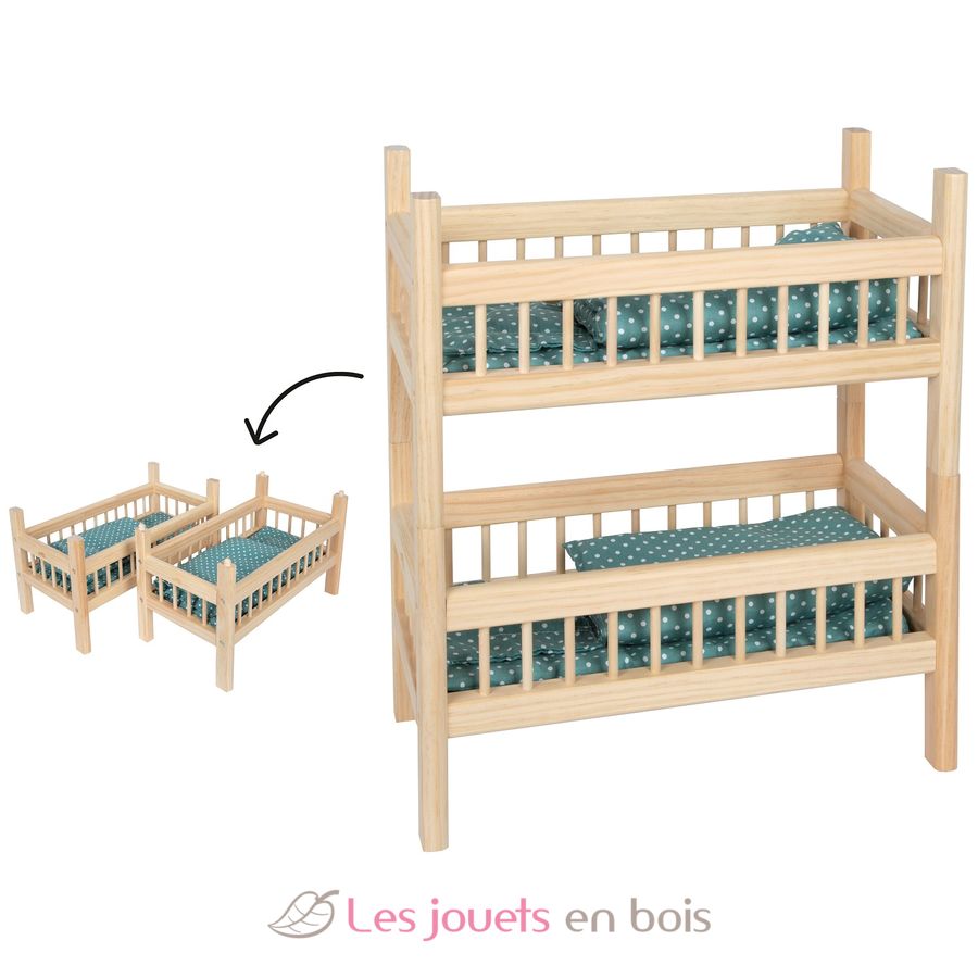 Ce lit superposé pour poupées en bois naturel offre un double confort pendant le sommeil, soit comme deux lits individuels, soit empilés pour gagner de la place comme lit superposé.