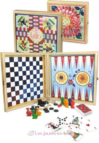 Ce magnifique coffret de jeux en bois sur le thème bucolique, illustré par Nathalie Lété, contient 5 jeux de société : jeu de dames, petits chevaux, baggamon, jeu de l’oie et jeu de cartes.