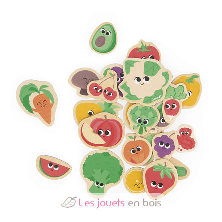 24 magnets Fruits et Légumes, des magnets en bois de la marque Janod. Référence J09648.
