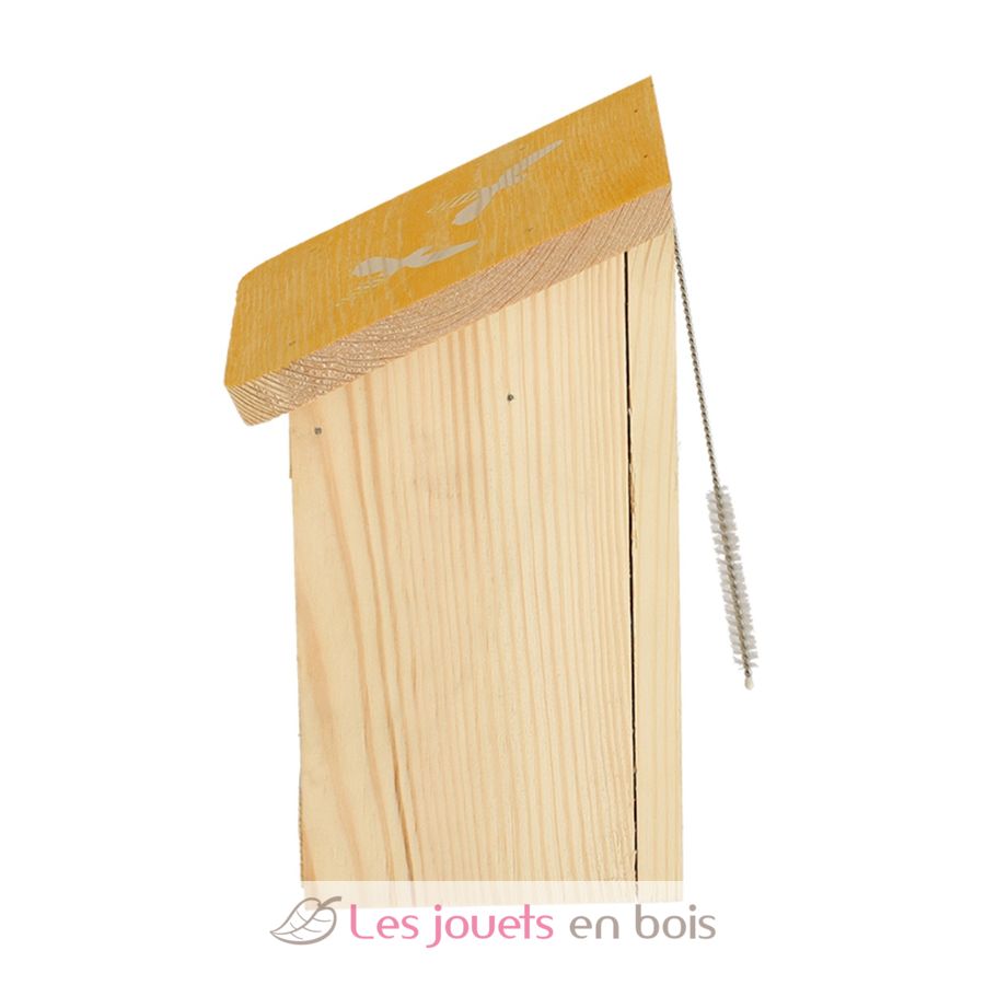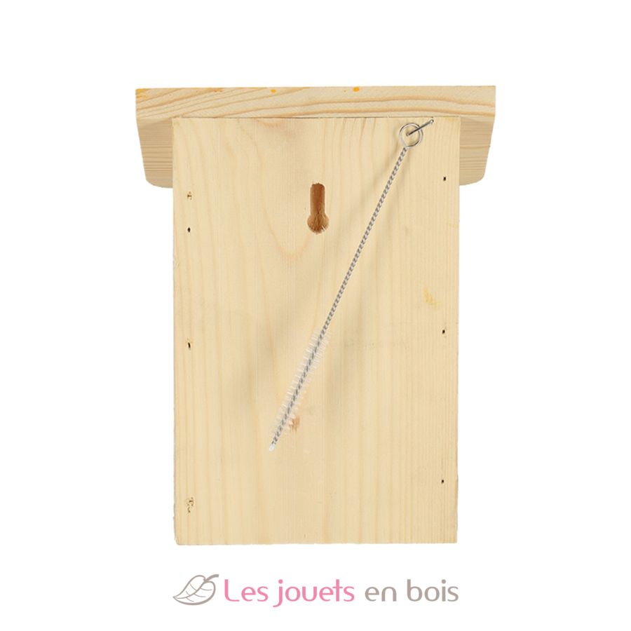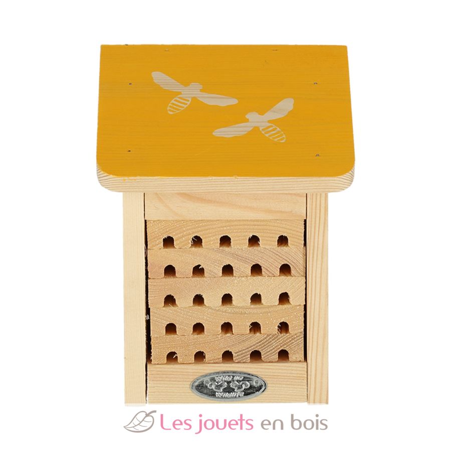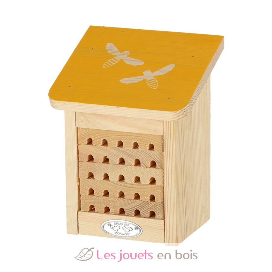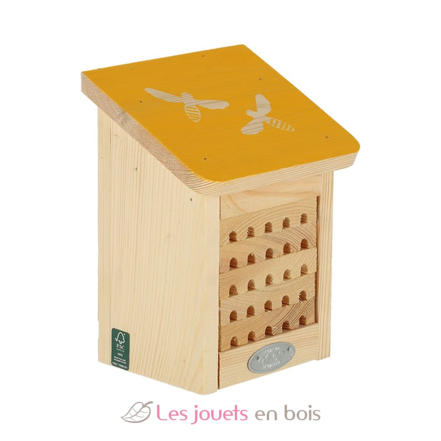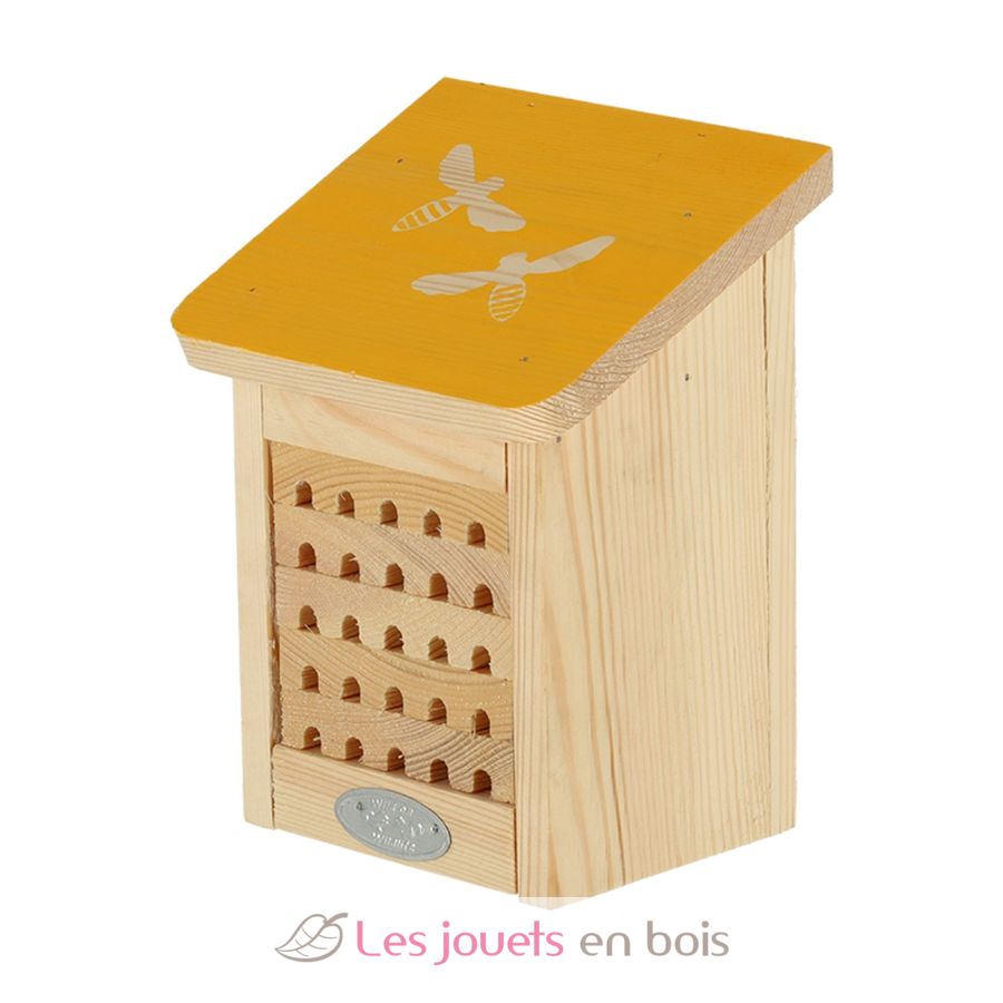 Abri à abeilles fabriqué en bois de pin certifié FSC, avec un toit de couleur vive décoré d'une silhouette-pochoir.
