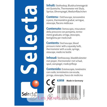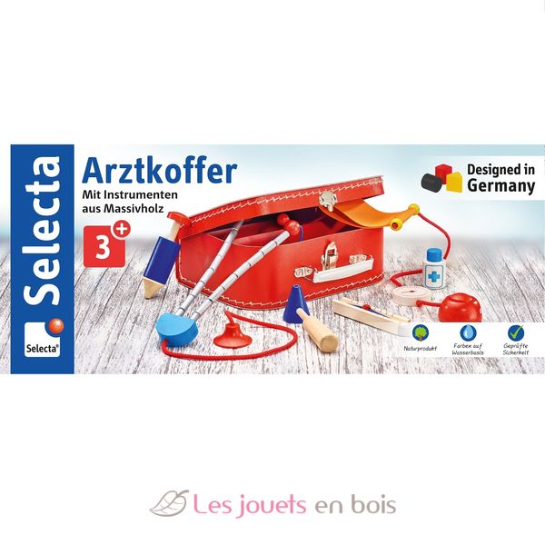 Tout ce dont un petit médecin a besoin se trouve dans cette mallette. Vous vous sentez mal ? Alors une visite chez le jeune docteur dans la chambre d’enfant vous soulagera certainement ! Son élégante trousse renferme de nombreux instruments solides et nécessaires à la visite médicale, le tout dans un design fiable adapté aux enfants. contenu : stéthoscope, tensiomètre à poire, thermomètre gradué, seringue, otoscope, flacons médicaux, carnet d’ordonnances Un jouet en bois fabriquée en Allemagne par Selecta.