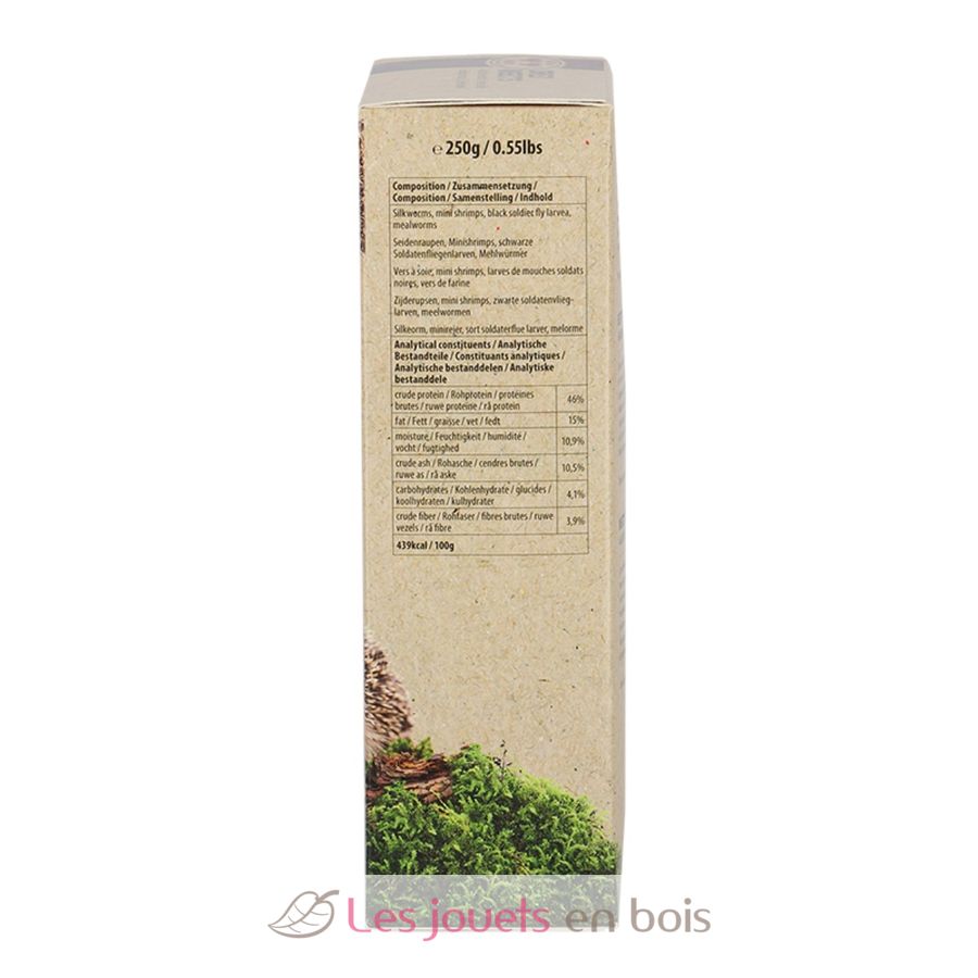 Ce mélange peut être utilisé toute l'année et convient aux oiseaux et aux hérissons. Riche en protéines, il se compose de vers à soie, mini crevettes, larves de mouches soldats noires, vers de farine. Format : 250 g.
