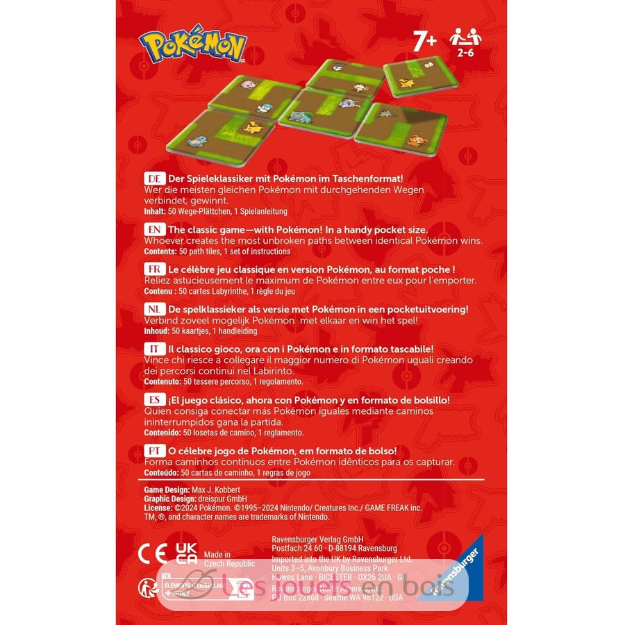 Entrez dans le labyrinthe et essayez de retrouver votre chemin grâce aux différents Pokémons. Posez astucieusement vos cartes pour relier des Pokémons identiques entre eux grâce aux chemins du labyrinthe. C'est votre seul moyen de tous les attraper ! Mais attention les chemins changent sans arrêt ! Labyrinth Pokémon Connect est un jeu de société pour toute la famille. Vous devrez faire preuve de tactique et d'un peu de chance pour espérer remporter la partie.