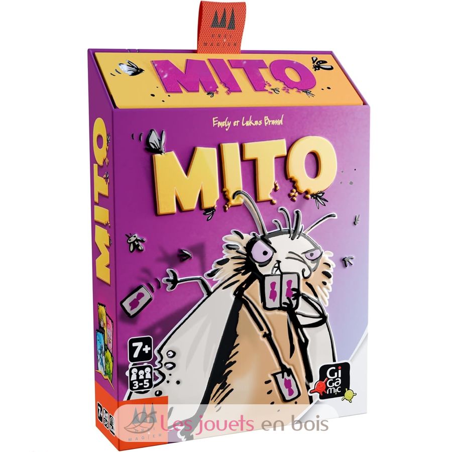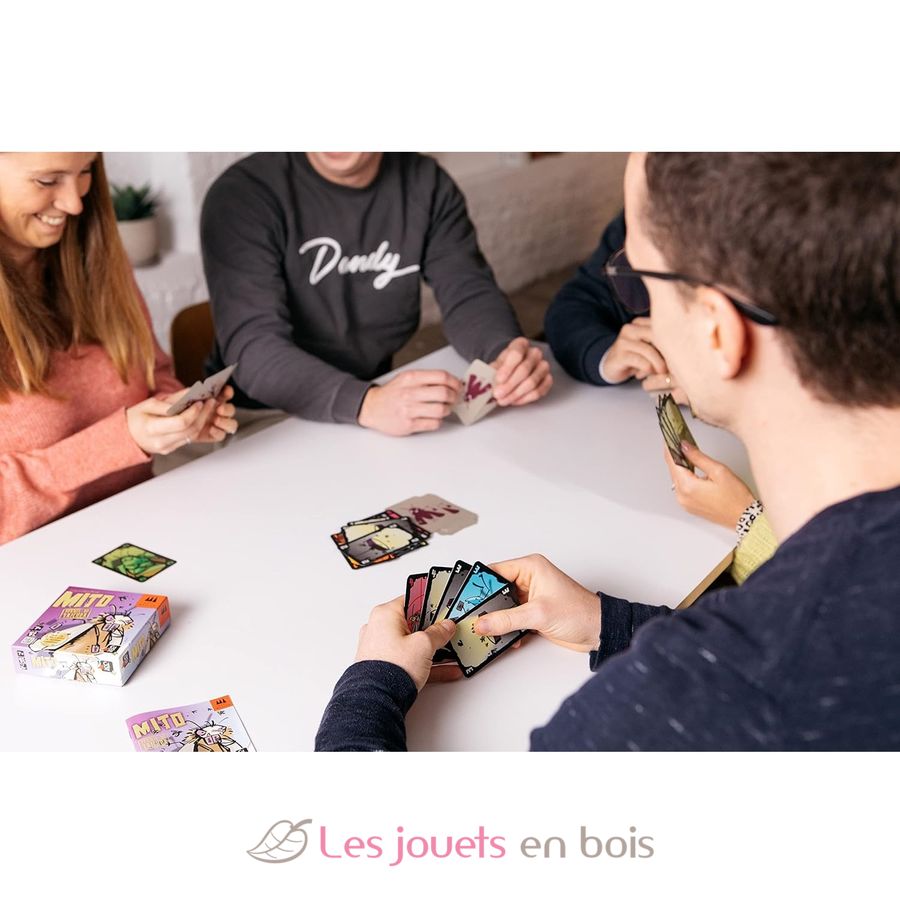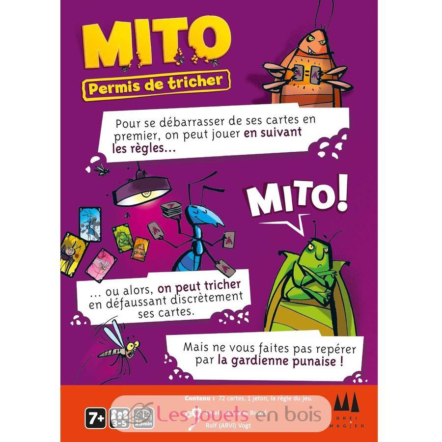 Pour se débarrasser au plus vite de ses cartes, tous les moyens sont bons, même… la triche ! Chacun son tour prend le rôle de la Gardienne Punaise qui veille au grain en surveillant les autres. Serez-vous honnête en respectant les règles ou allez-vous tricher ? Mettre une carte dans sa manche, en faire tomber sur ses genoux, … à condition de ne pas se faire prendre, tout est possible ! Attention toutefois à rester attentif au jeu, car des cartes spéciales viennent régulièrement bousculer la partie. Mito est un jeu «mitique» et complètement dingo.