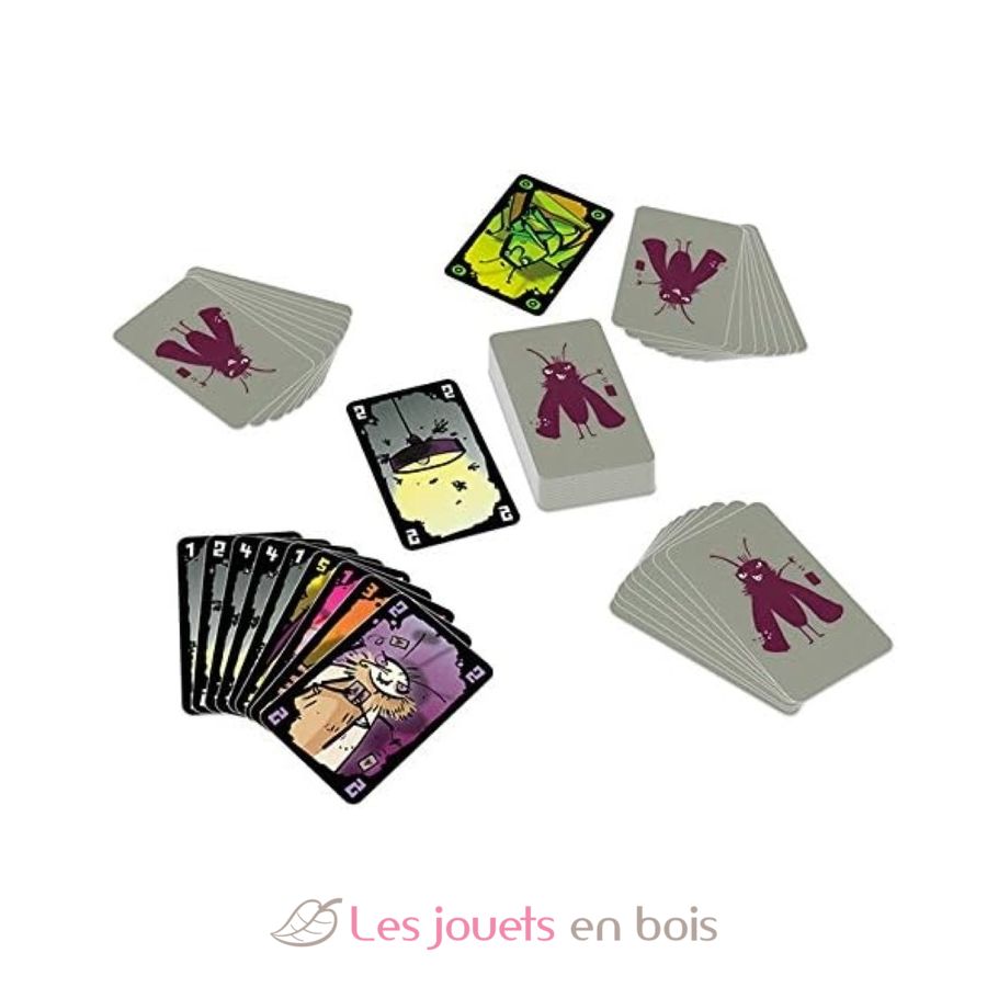 Contenu : 72 cartes dont : 20 cartes Action (5 araignées, 5 moustiques, 5 cafards, 5 fourmis), 43 cartes Nombre, 8 carte Mito, 1 gardienne punaise, Règle du jeu