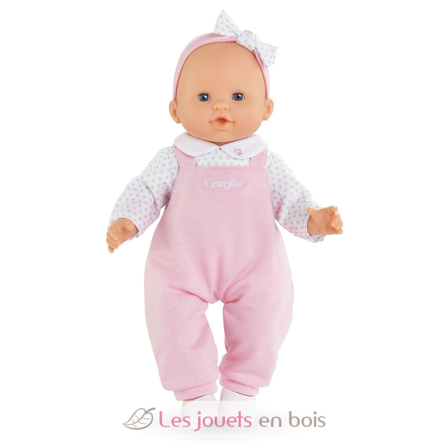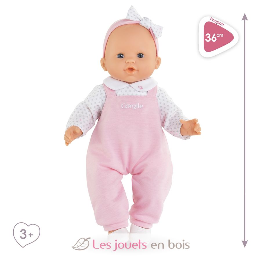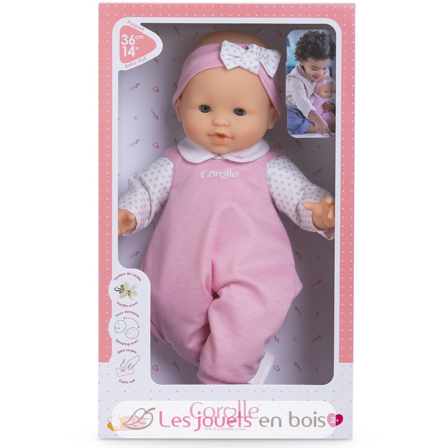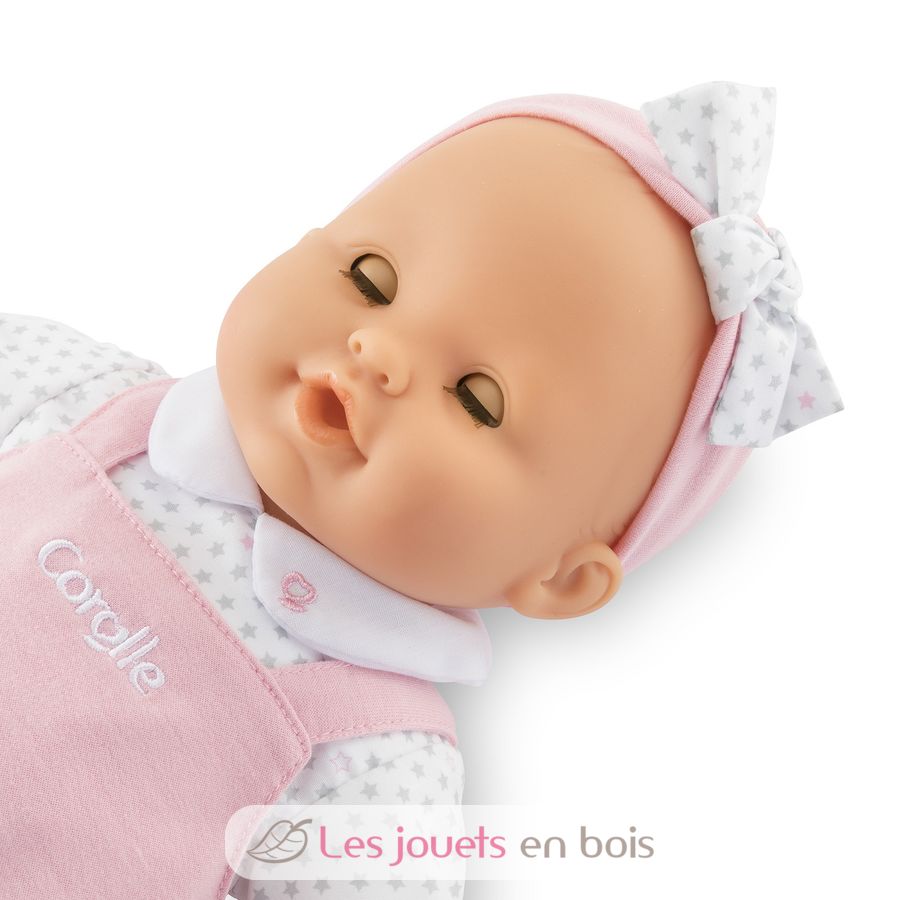 Son corps souple lui permet de prendre les mêmes positions qu'un vrai bébé et de tenir assis. Son visage, ses bras et ses jambes sont en vinyle doux au toucher, à la délicate senteur de vanille, signature des poupées Corolle. Avec ses yeux dormeurs, il ferme les yeux pour faire dodo quand on le couche sur le dos. Cette poupée peut prendre une tétine ou bien sucer son pouce.