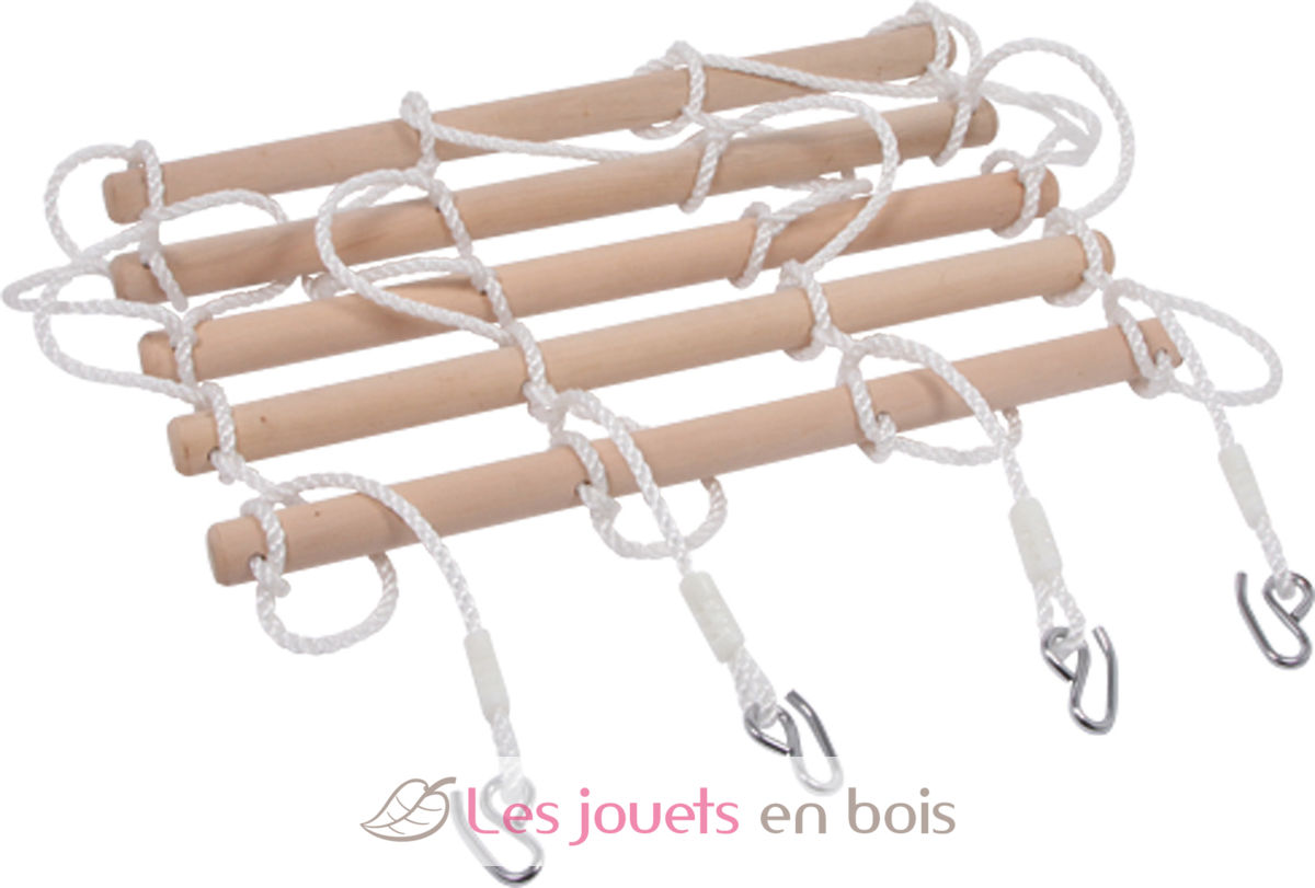 Un défi pour les petits artistes grimpeurs! 5 barres de bois (4 x 68 cm) sont sûrement fixées à 4 cordes solides. Un bon exercice pour apprendre à maîtriser son corps et pour la force! D'une hauteur d'1,95 mètre, il peut aussi être utilisé comme échelle de cordes pour pouvoir monter facilement dans les hauteurs aériennes! Poids maximum 120 kg.