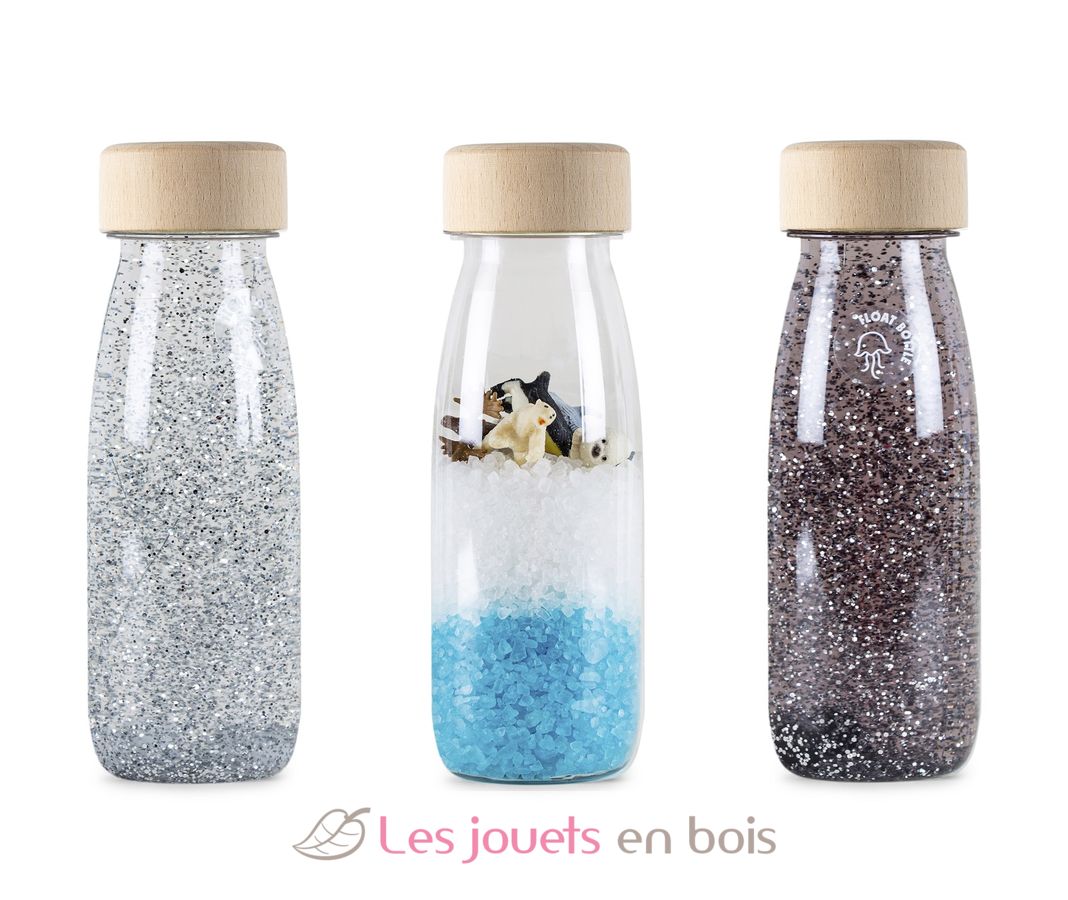 Découvrez le pack de 3 bouteilles sensorielles Ice de la marque Petit Boum : 1 bouteille sensorielle Float argent, 1 bouteille sensorielle Float noire et 1 bouteille sensorielle Spy arctique. Des jouets d’éveil colorés, inspirés de la pédagogie Montessori, qui stimulent les sens des bébés dès 3 mois.