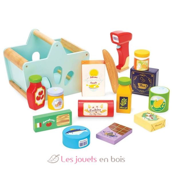 Cet ensemble de produits d'épicerie de la marque Le Toy Van comprend un panier en bois, des accessoires d'épicerie et un lecteur de codes à barres.