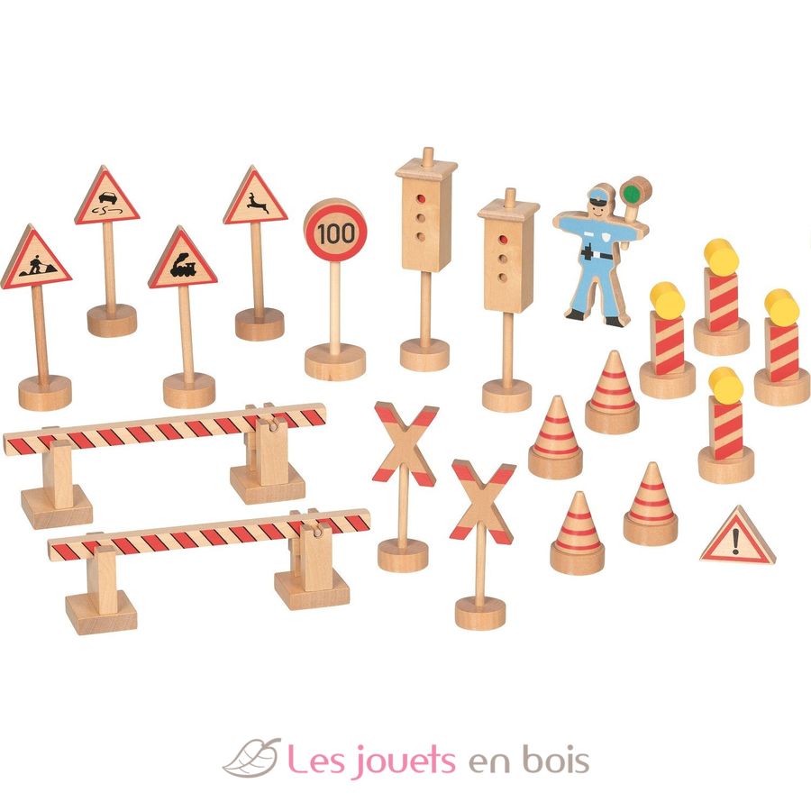 L'agent de police Ole est responsable de la circulation. Cet ensemble de 20 panneaux de signalisation en bois lui fournit tout le matériel dont il a besoin pour assurer la sécurité sur la route.