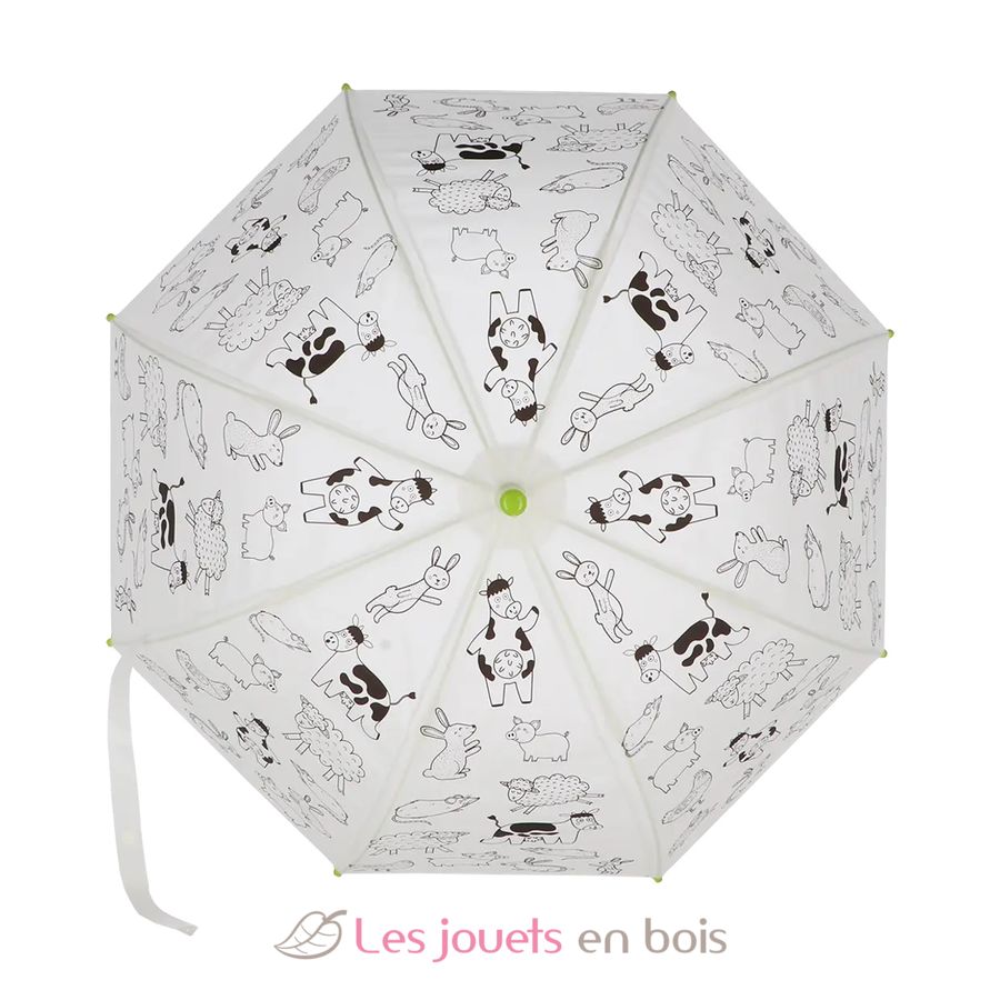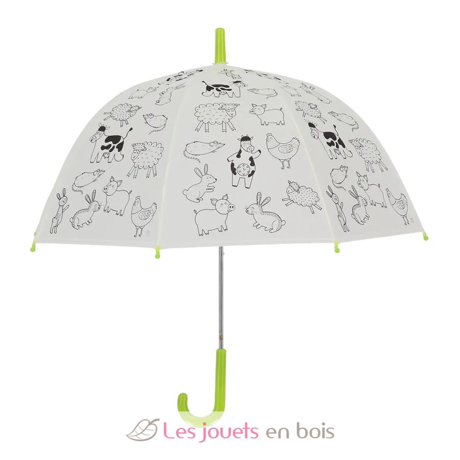 Ce parapluie ludique pour enfant présente un fond blanc avec de jolis dessins de leurs animaux préférés. Le plus amusant ? Les enfants peuvent le colorier eux-mêmes ! Grâce aux 9 feutres inclus, chaque animal de la ferme peut prendre vie selon l'imagination de l'enfant. Matières : fibre de verre, acier et plastique.