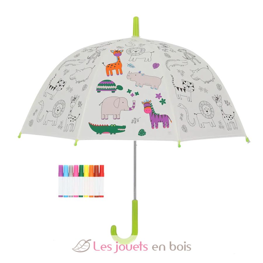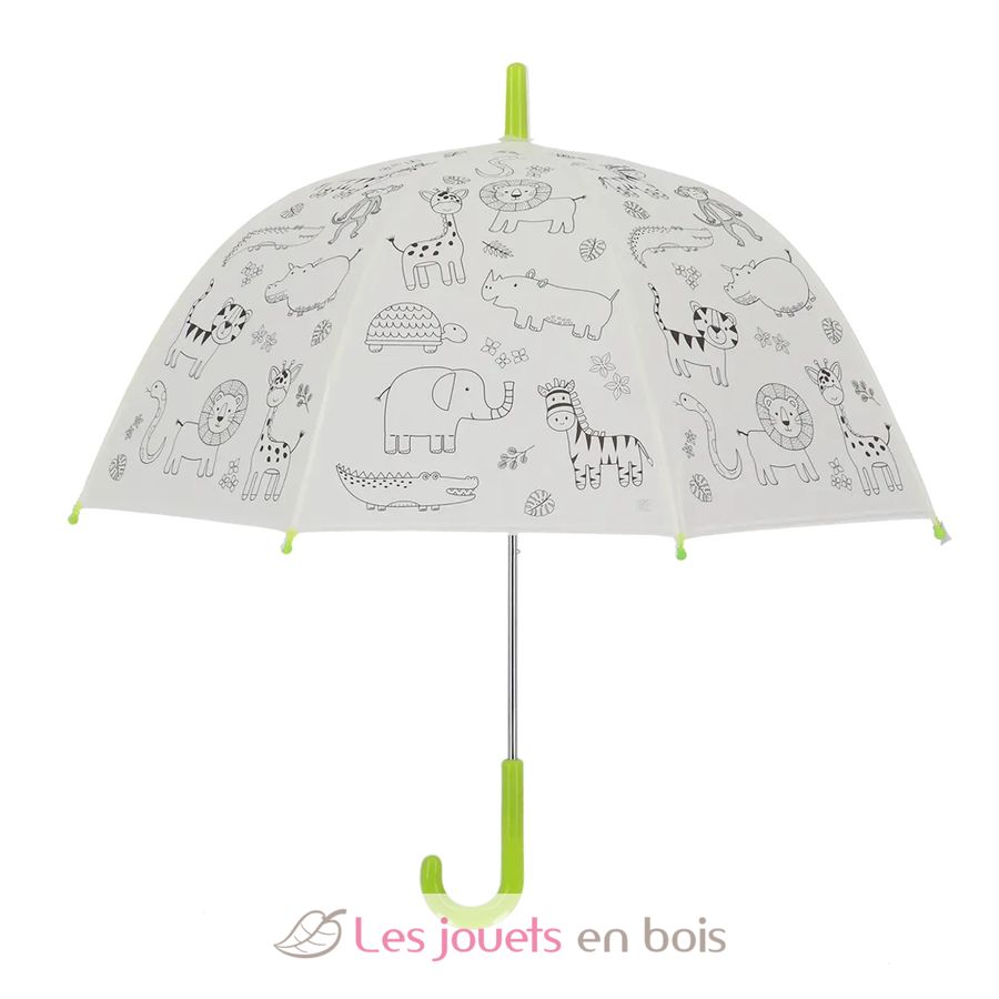 Ce parapluie ludique pour enfant présente un fond blanc avec de jolis dessins de leurs animaux préférés. Le plus amusant ? Les enfants peuvent le colorier eux-mêmes ! Grâce aux 9 feutres inclus, chaque animal de la jungle peut prendre vie selon l'imagination de l'enfant. Matières : fibre de verre, acier et plastique.