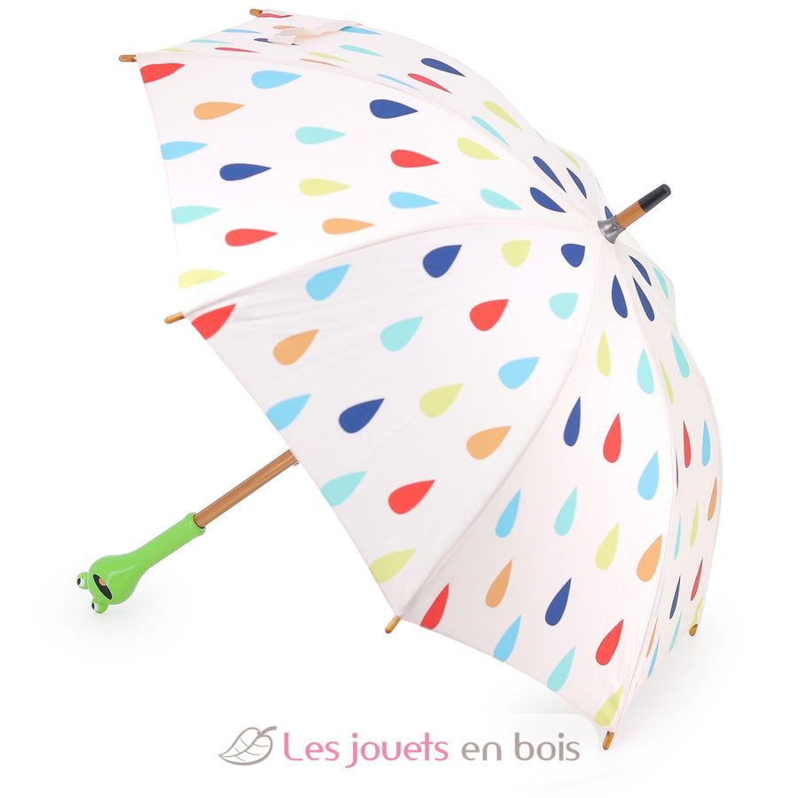 Même sous la pluie, Babeth la rainette garde le sourire ! Un parapluie solide et coloré pour égayer les jours de pluie.