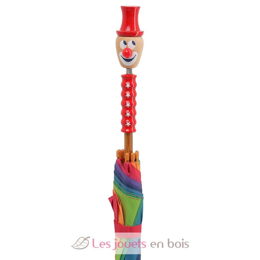 Même sous la pluie, le clown sort son grand chapeau rouge et garde le sourire ! Un parapluie solide et coloré pour égayer les jours de pluie.