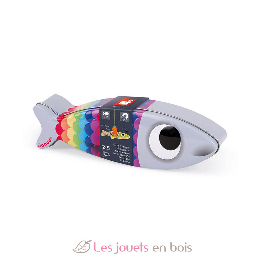 Ce jeu de pêche à la ligne est composé de 10 poissons sardines rigolos et de 2 cannes à pêche en bois avec un hameçon plastique en forme de poisson. Ce jeu est présenté dans une jolie boite en métal en forme de sardine avec les yeux et les écailles qui sont en relief.