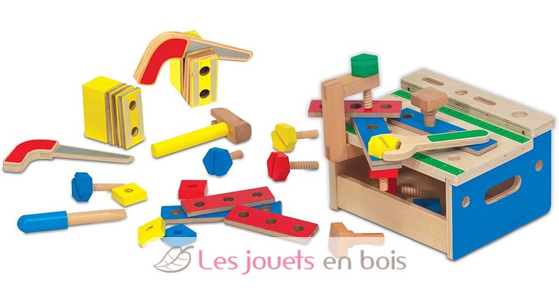Cet établi est équipé de 5 outils (scie, marteau, tournevis, clé, serre-joint) et de 26 pièces de construction (vis, clous, écrous, panneaux de bois à scier...).