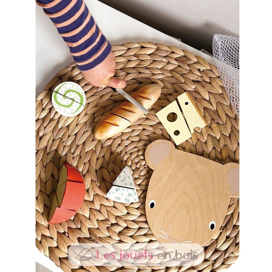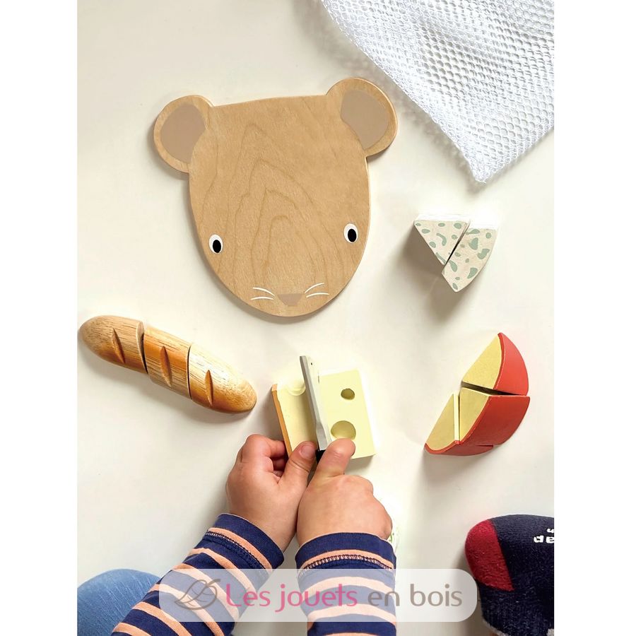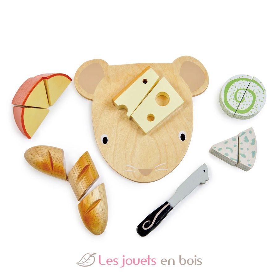 Cet ensemble d'aliments en bois à découper se compose d'un plateau à fromage en bois en forme de souris, un couteau à fromage souris, une baguette, un Edam, un Gruyère, un roulé ail et fines herbes, et un bleu. Tous les morceaux sont attachés avec des scratchs pour une coupe facile. Sac en filet inclus pour le rangement.