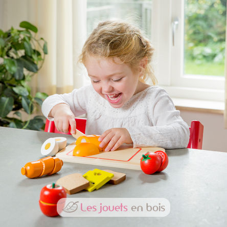 Cet ensemble de 19 pièces en bois comprend une planche à découper (24 x 16 cm), un faux couteau ainsi qu'une sélection d'aliments qui peuvent être découpés puis reconstitués grâce aux tissu auto-agrippant astucieux : une tomate, une pomme, un œuf, une saucisse, une baguette de pain, mais aussi deux tranches de pain et de fromage.