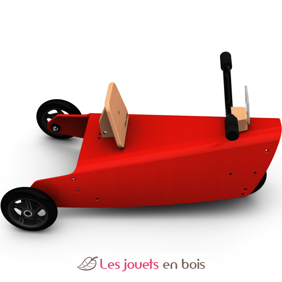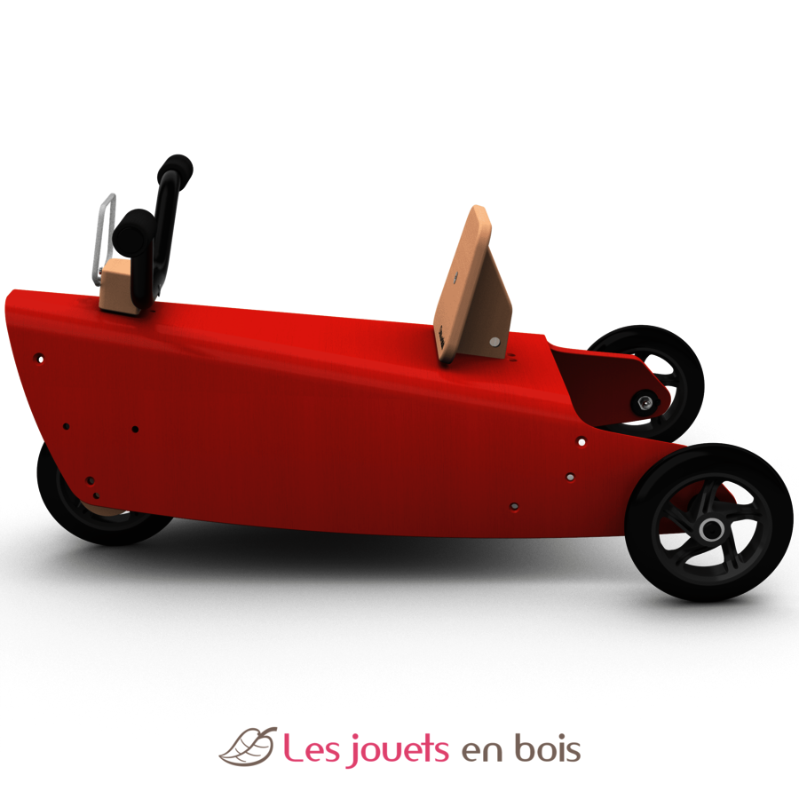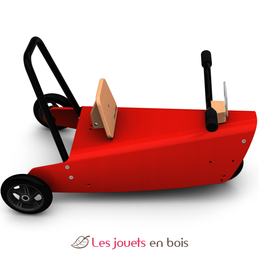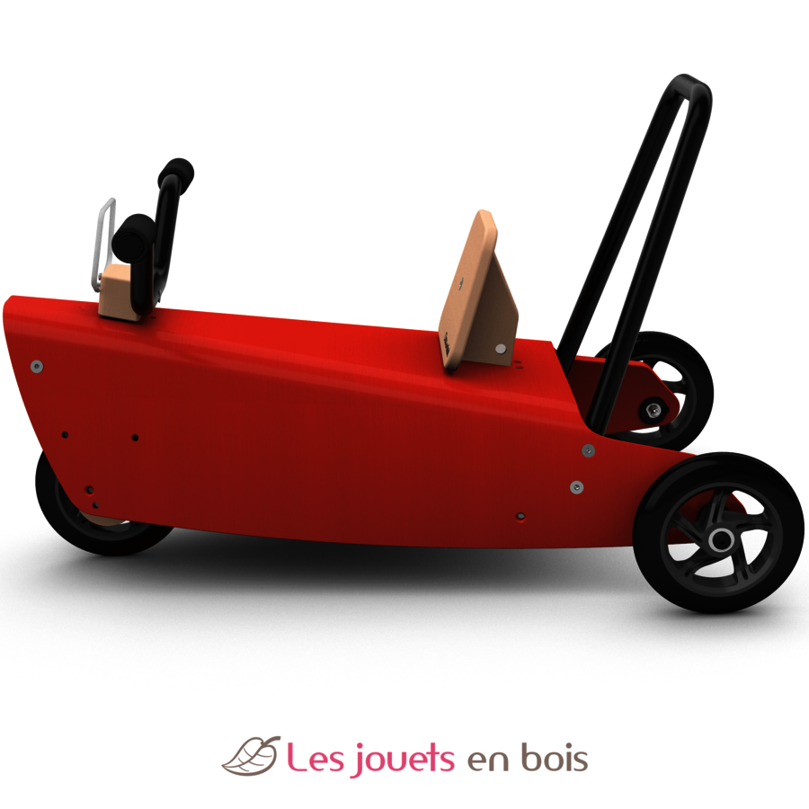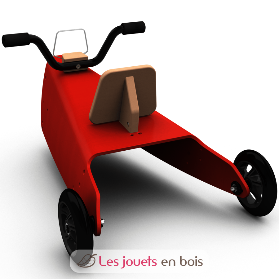 Ce Porteur Moto est constitué d'une pièce principale (la "plateforme") en hêtre, d'une fourche de direction, d'une platine de direction, d'un dossier pour l’assise, d'un guidon, d'un arceau arrière en acier avec poignées en mousse de couleur noire, d'un pare-brise transparent incassable en polycarbonate et de 3 roues silencieuses avec roulements à bille de précision ne laissant pas de traces sur les sols, positionnées pour ne pas gêner le mouvement des jambes de l’enfant. Ce porteur peut s'utiliser à l'intérieur comme à l'extérieur, en raison de la qualité des roues.
