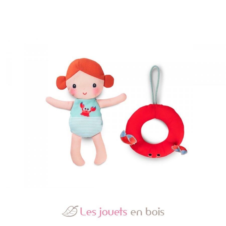 Idéale pour les enfants dès 9 mois, cette petite poupée de bain et sa bouée vont enchanter le moment de se laver. Sa texture douce, moelleuse et légère lui permettent de flotter dans sa bouée et de facilement sécher une fois hors de l'eau. Elle mesure 18 cm de haut. Avec ses jolies couettes, voici Axelle : son activité favorite au bord de l'eau, c'est fouiller dans le sable ou entre les rochers à la recherche de petites bêtes. Pour preuve, sa bouée rouge et son maillot de bain représentent tout deux un joyeux crabe rouge !