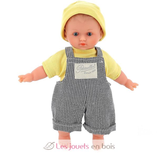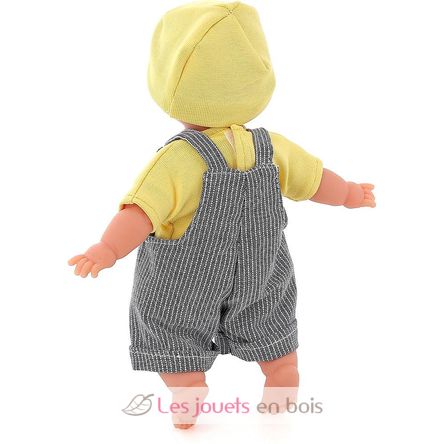 Cette poupée possède des yeux bleus fixes, des cheveux peints châtains et porte une belle salopette avec un tee-shirt et un bonnet jaune. Cet adorable poupon va pouvoir partager les jeux, les aventures et les secrets des tout-petits dès l'âge de 10 mois.