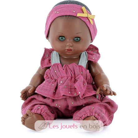Cette poupée est entièrement fabriquée en vinyle souple, avec un délicat parfum de vanille, au sein de l'atelier Petitcollin situé à Étain en France. Cette poupée possède des yeux dormeurs verts avec cils et des cheveux peints noirs. Sa tenue se compose d'une jolie combinaison en double gaze de couleur framboise à paillettes dorées, avec un bandeau assorti sur sa tête.
