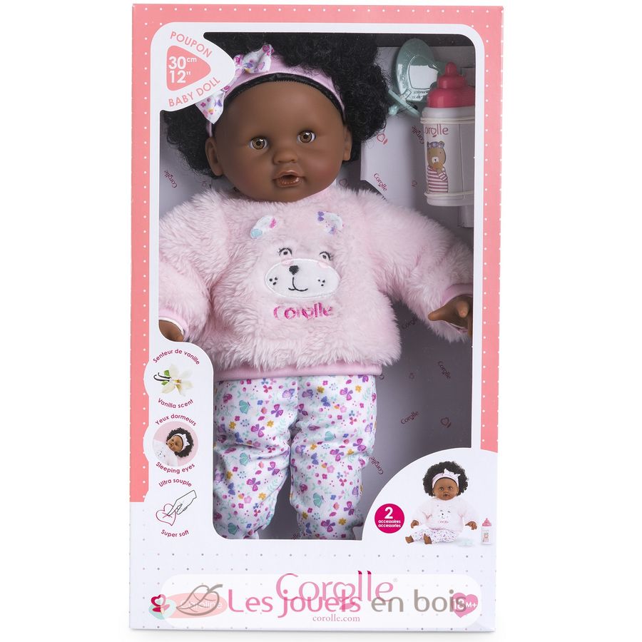 Son corps souple lui permet de prendre les mêmes positions qu'un vrai bébé. Son visage, ses bras et ses jambes sont en vinyle doux au toucher, à la délicate senteur de vanille, signature des poupées Corolle. Avec ses yeux dormeurs, il ferme les yeux pour faire dodo quand on le couche sur le dos.