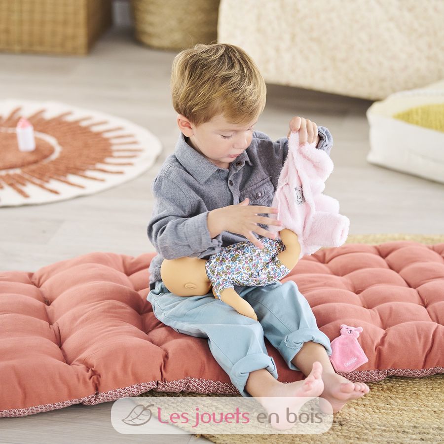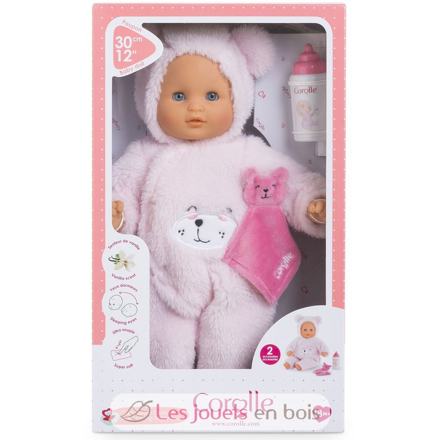 Son corps souple lui permet de prendre les mêmes positions qu'un vrai bébé. Son visage, ses bras et ses jambes sont en vinyle doux au toucher, à la délicate senteur de vanille, signature des poupées Corolle. Avec ses yeux dormeurs, il ferme les yeux pour faire dodo quand on le couche sur le dos.