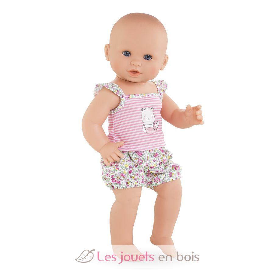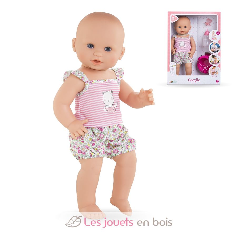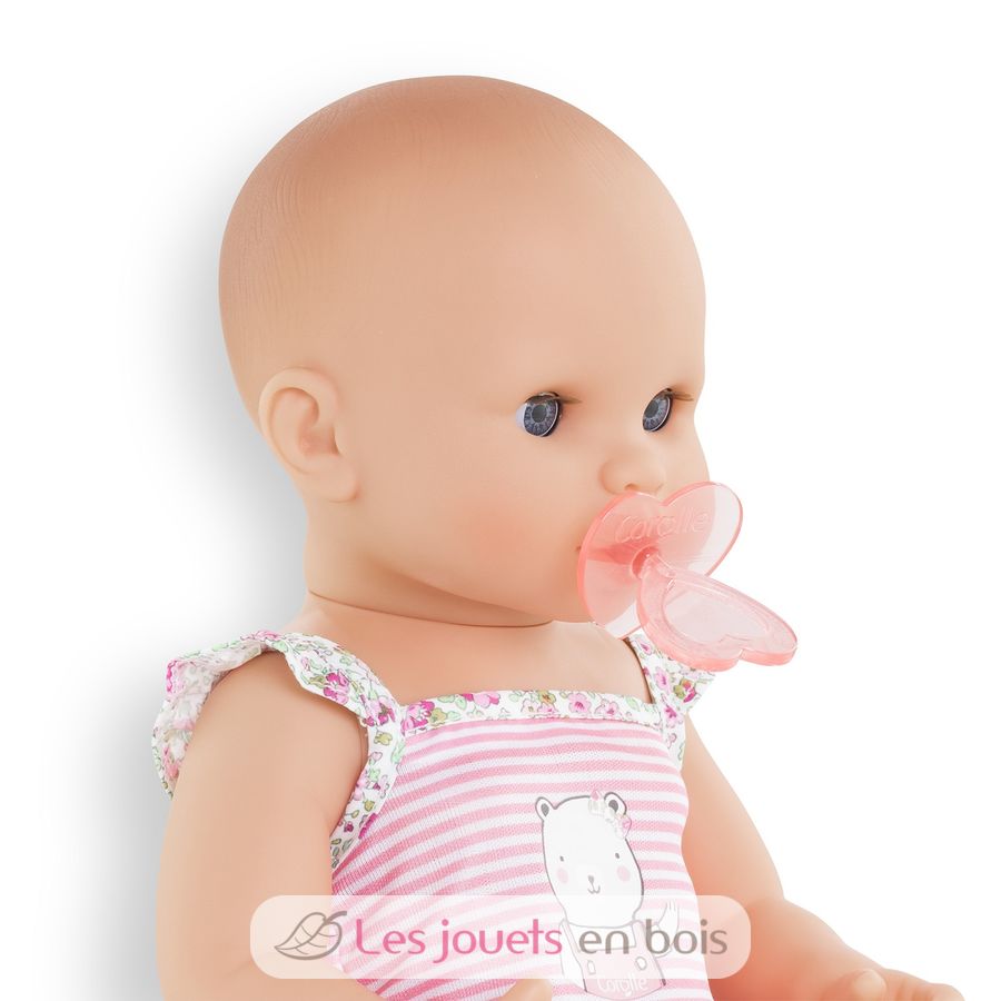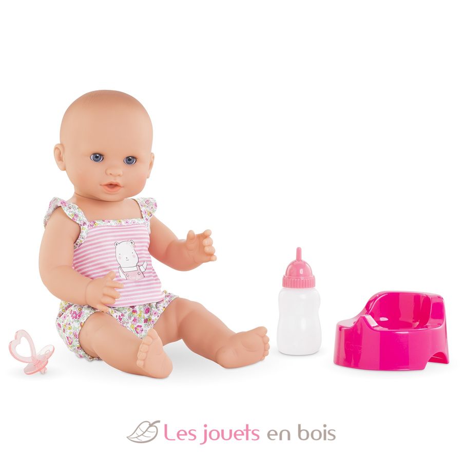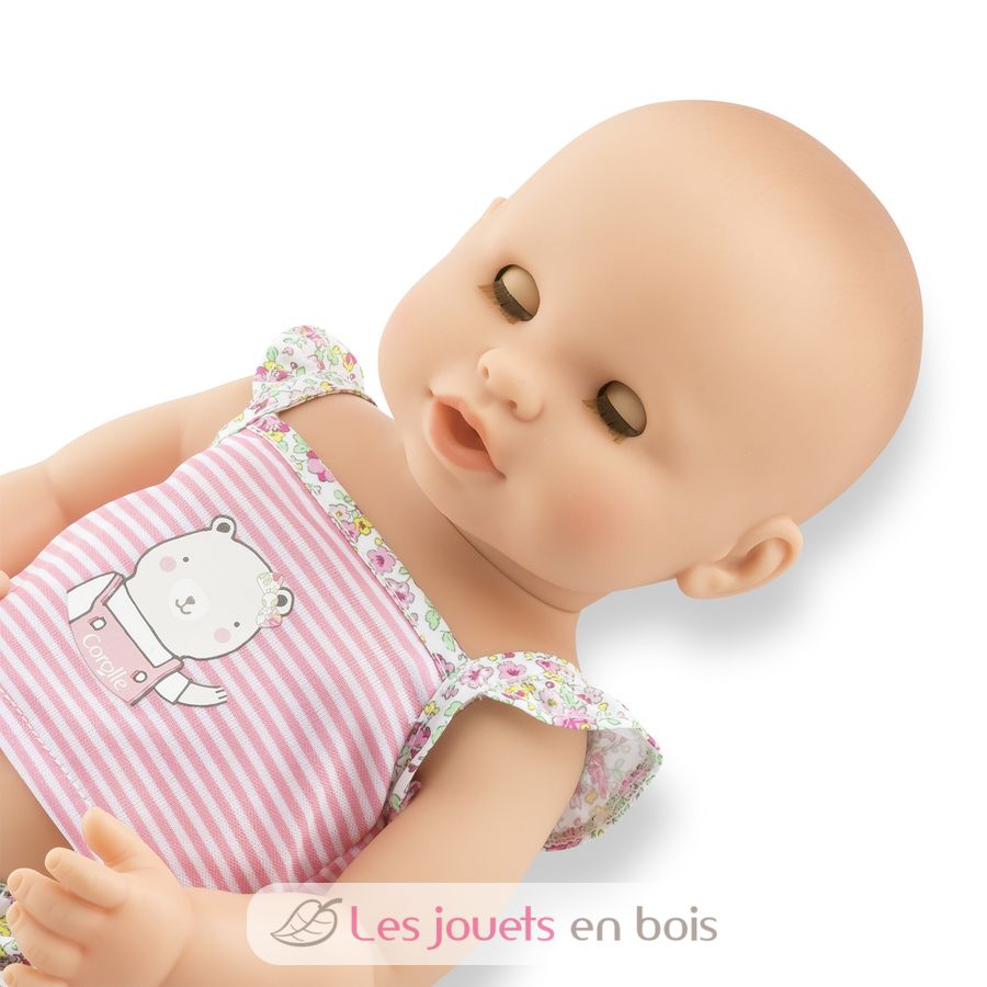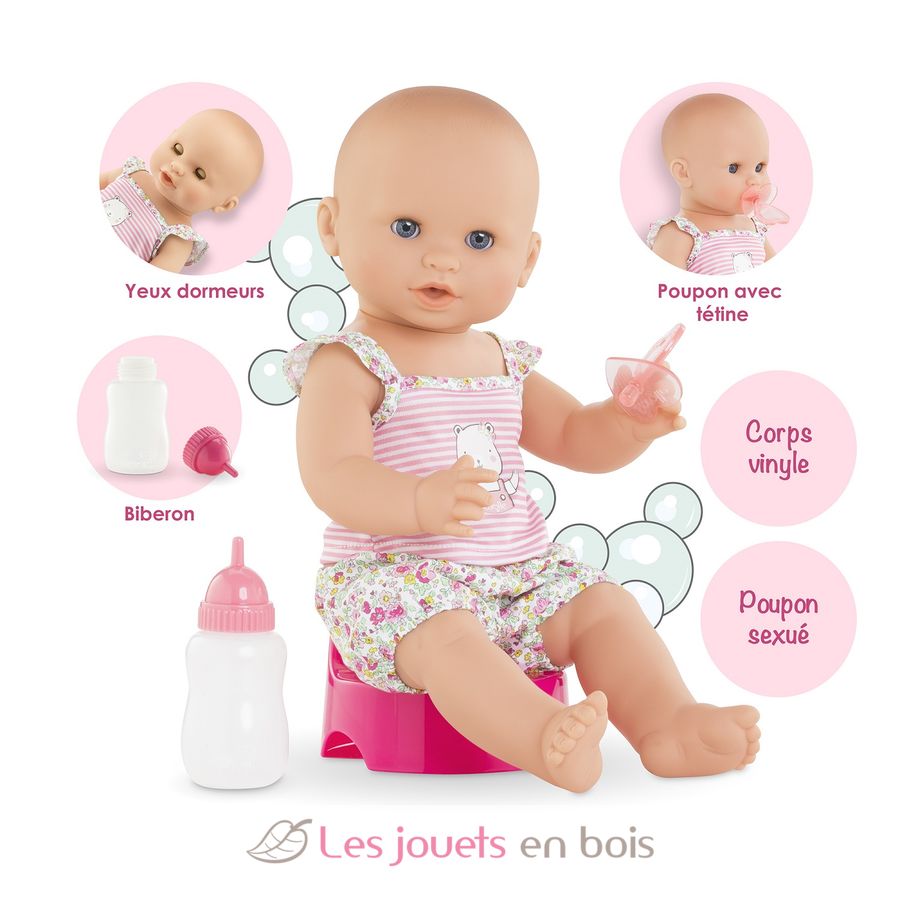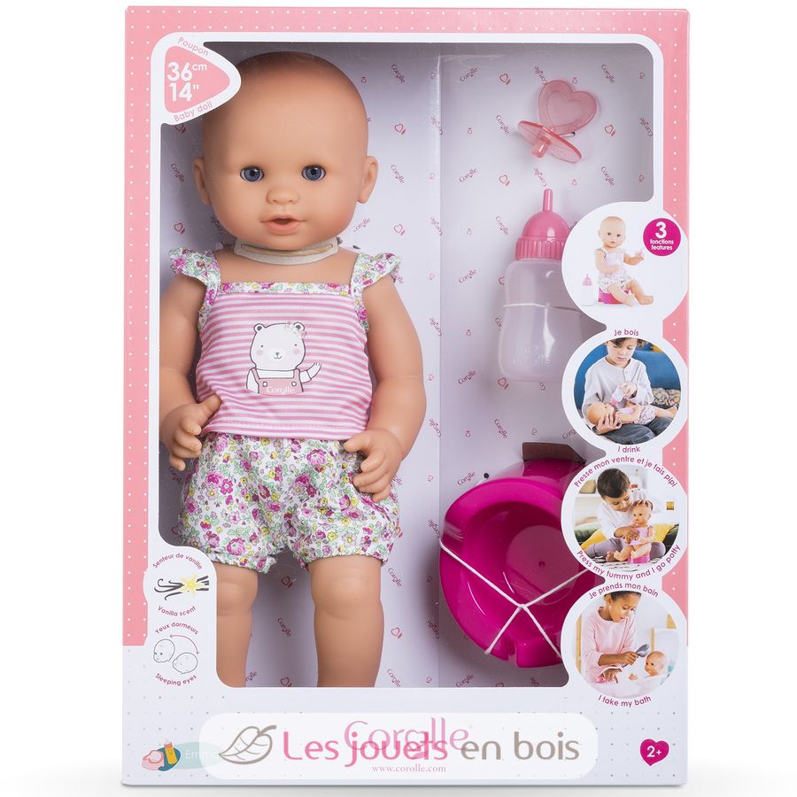 Cette poupée très réaliste tient assise toute seule. Véritable baigneur, ce poupon peut aller dans l'eau en toute sécurité, grâce à son corps totalement en vinyle. Il est doté d'une délicate senteur de vanille, signature des poupées Corolle. Avec ses yeux dormeurs, il ferme les yeux pour faire dodo quand on le couche sur le dos. Il peut prendre une tétine ou bien sucer son pouce.