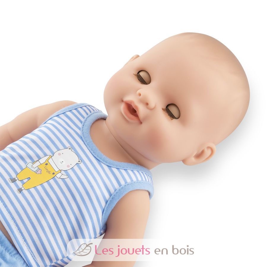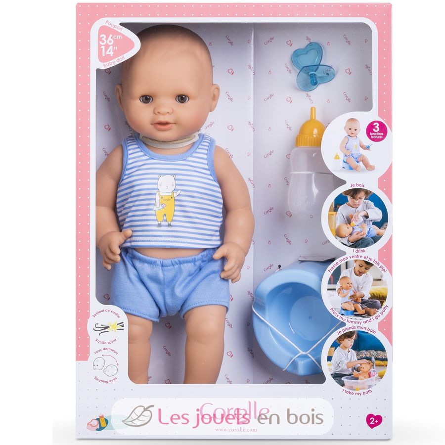 Cette poupée très réaliste tient assise toute seule. Véritable baigneur, ce poupon peut aller dans l'eau en toute sécurité, grâce à son corps totalement en vinyle. Il est doté d'une délicate senteur de vanille, signature des poupées Corolle. Avec ses yeux dormeurs, il ferme les yeux pour faire dodo quand on le couche sur le dos. Il peut prendre une tétine ou bien sucer son pouce.