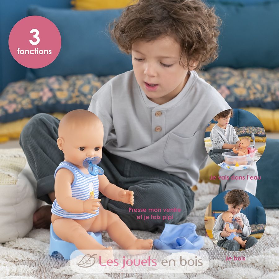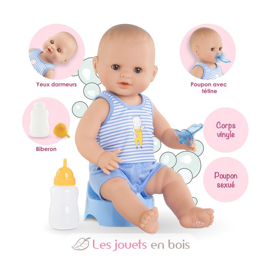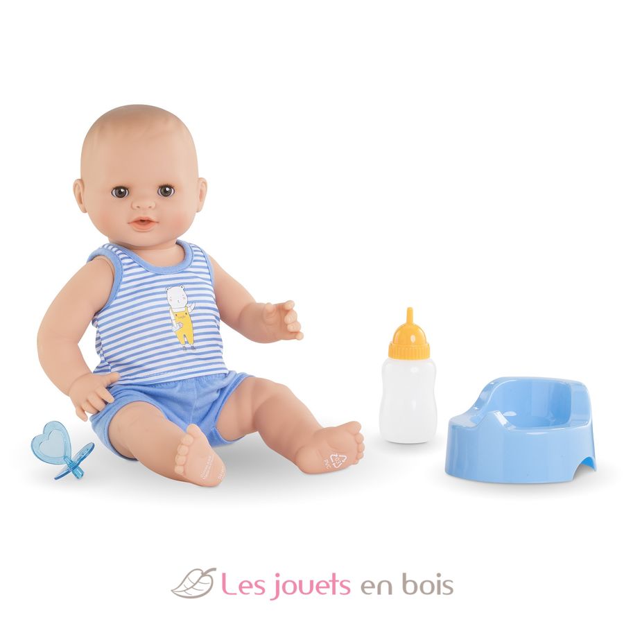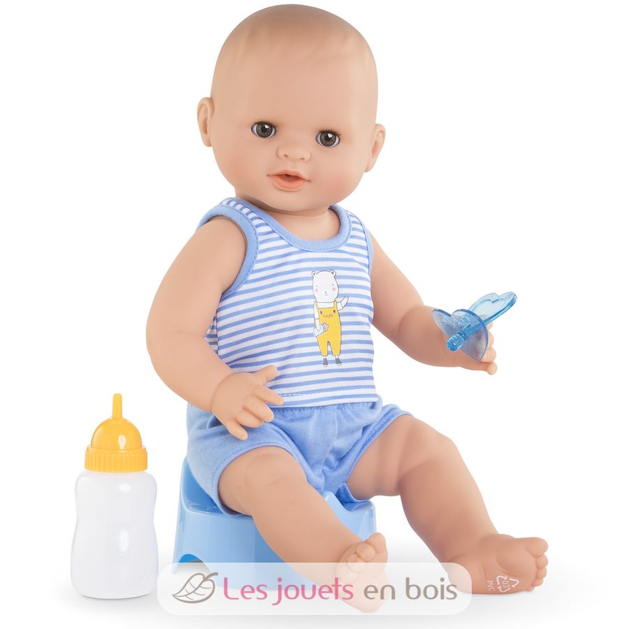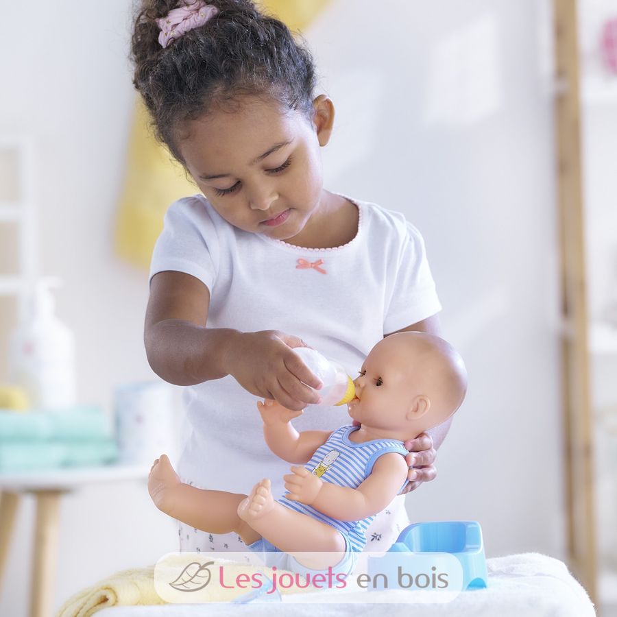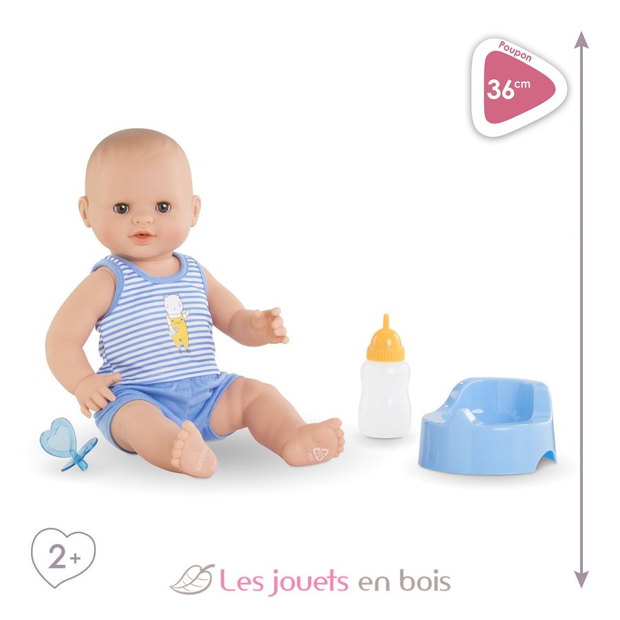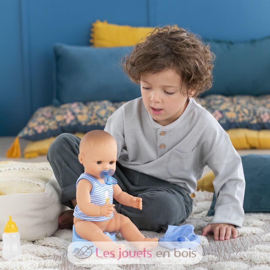 Avec ses 3 accessoires inclus (son pot, son biberon et sa tétine), ce grand poupon sexué garçon de 36 cm :