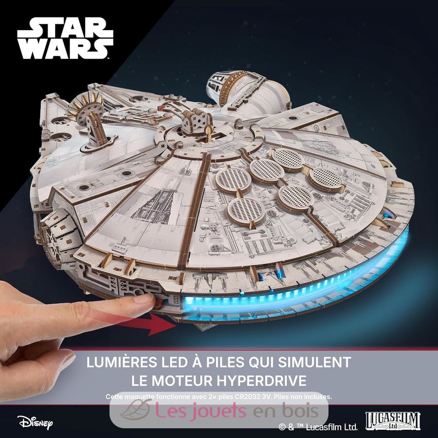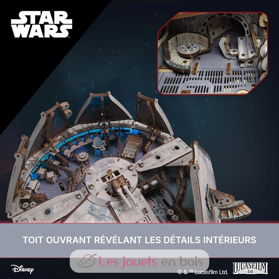 Construisez le légendaire Faucon Millennium avec ce puzzle en bois 3D très détaillé ! Il comprend des lumières LED bleues alimentées par pile, un toit rétractable, une soute et une rampe ouvrantes, des tourelles mobiles et une antenne rotative à 360°. Des détails intérieurs et extérieurs complexes reproduisent fidèlement ce vaisseau emblématique de la saga Star Wars.