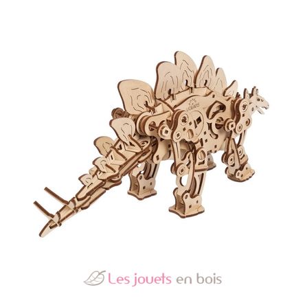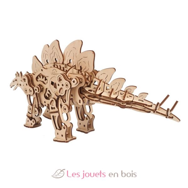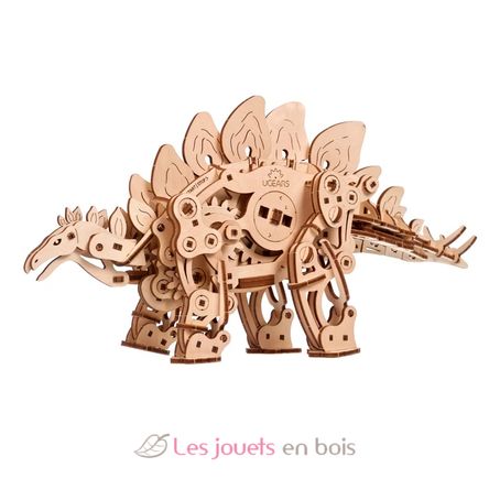 Le Stégosaure Ugears est un automate de dinosaure en bois à monter soi-même à quatre pattes, actionné par un ressort, capable de marcher jusqu'à un mètre sur un seul enroulement. La clé de remontage se trouve dans le ventre du dinosaure, avec des fentes de remontage de chaque côté. La plaque osseuse située au-dessus de l'épaule du dinosaure sert d'interrupteur Marche/Arrêt. Repoussez la plaque avant de donner jusqu'à dix demi-tours à la clé, puis posez le stégosaure sur une surface plane, faites glisser la plaque de l'épaule vers l'avant et regardez votre fossile vivant s'éloigner à la recherche de son prochain repas ! Un engrenage excentrique fait osciller la queue en synchronisation avec les pattes, ce qui permet au dinosaure de marcher de façon réaliste.