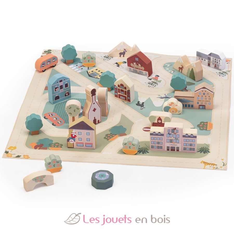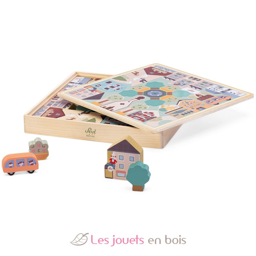 A la fois puzzle en bois et jeu de construction avec son tapis de jeu, cet ensemble de jeu permet de reconstituer le village d'Ortisei, un petit village des montagnes des Dolomites, aux origines des jouets Sevi.