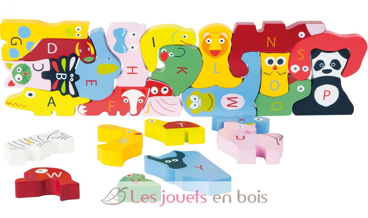 26 pièces. A,B,C,D,E,F,G... Maintenant je connais toutes les lettres de l'alphabet ! Chacun des animaux en bois coloré représente une lettre. En associant les pièces correctement, tu pourras mettre les lettres dans l'ordre de l'alphabet. Voici une manière ludique d'apprendre l'alphabet. Lorsque les animaux sont correctement juxtaposés, ils forment l'alphabet complet. A,B,C .... Connais-tu la suite ?