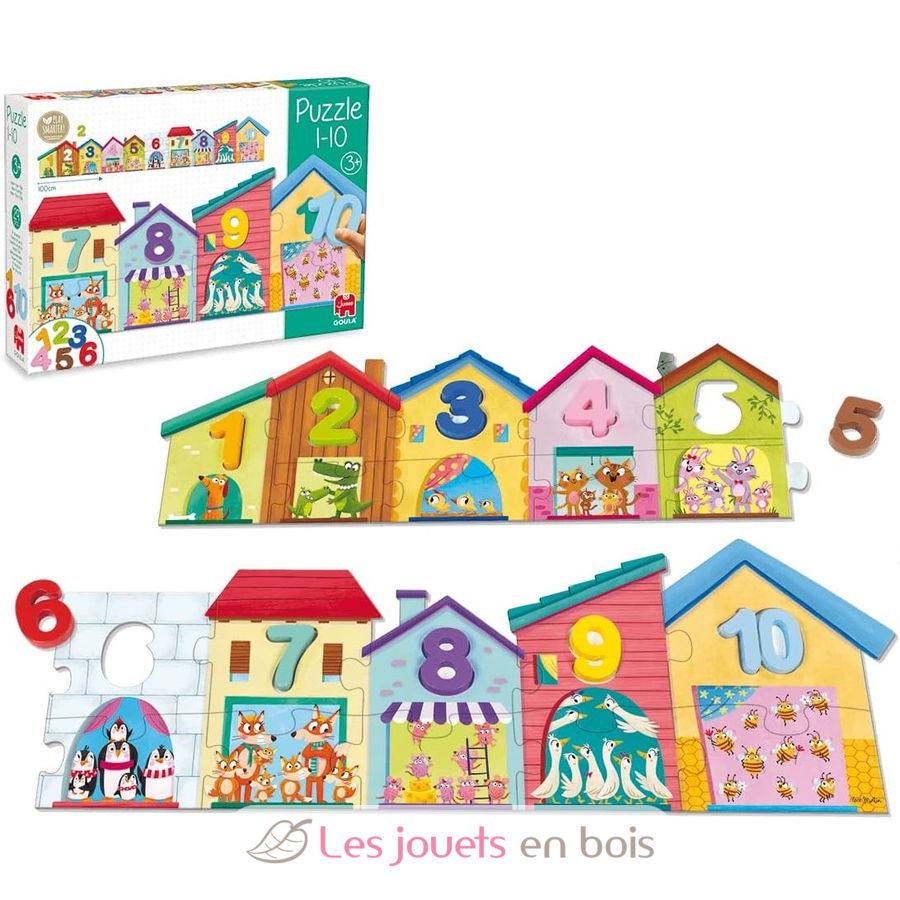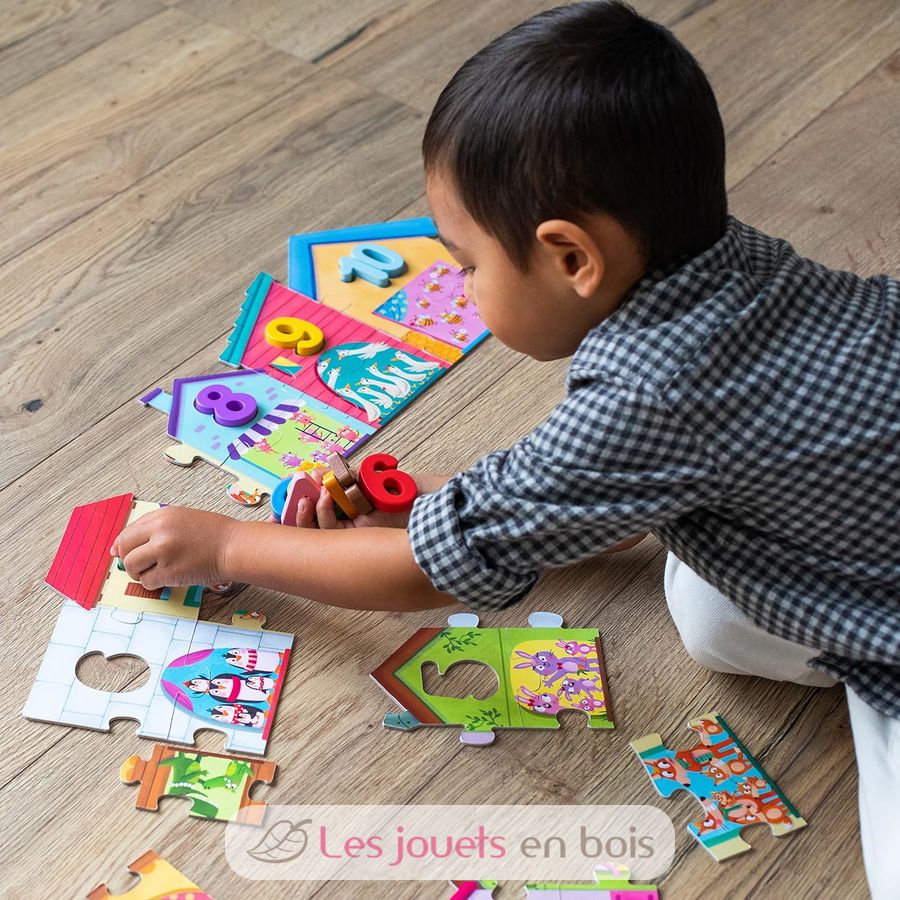 Ce puzzle géant se compose de 20 pièces en carton avec des illustrations de maisons colorées et des animaux à l’intérieur, ainsi que de 10 chiffres en bois de 1 à 10.