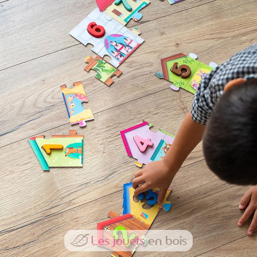 L'enfant est guidé par la silhouette du chiffre présente sur la pièce de puzzle ou par les animaux qui sont illustrés à l’intérieur des maisons.