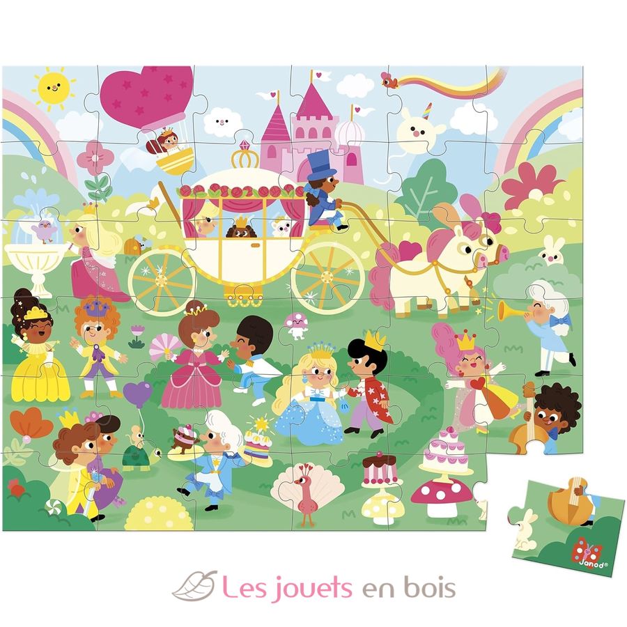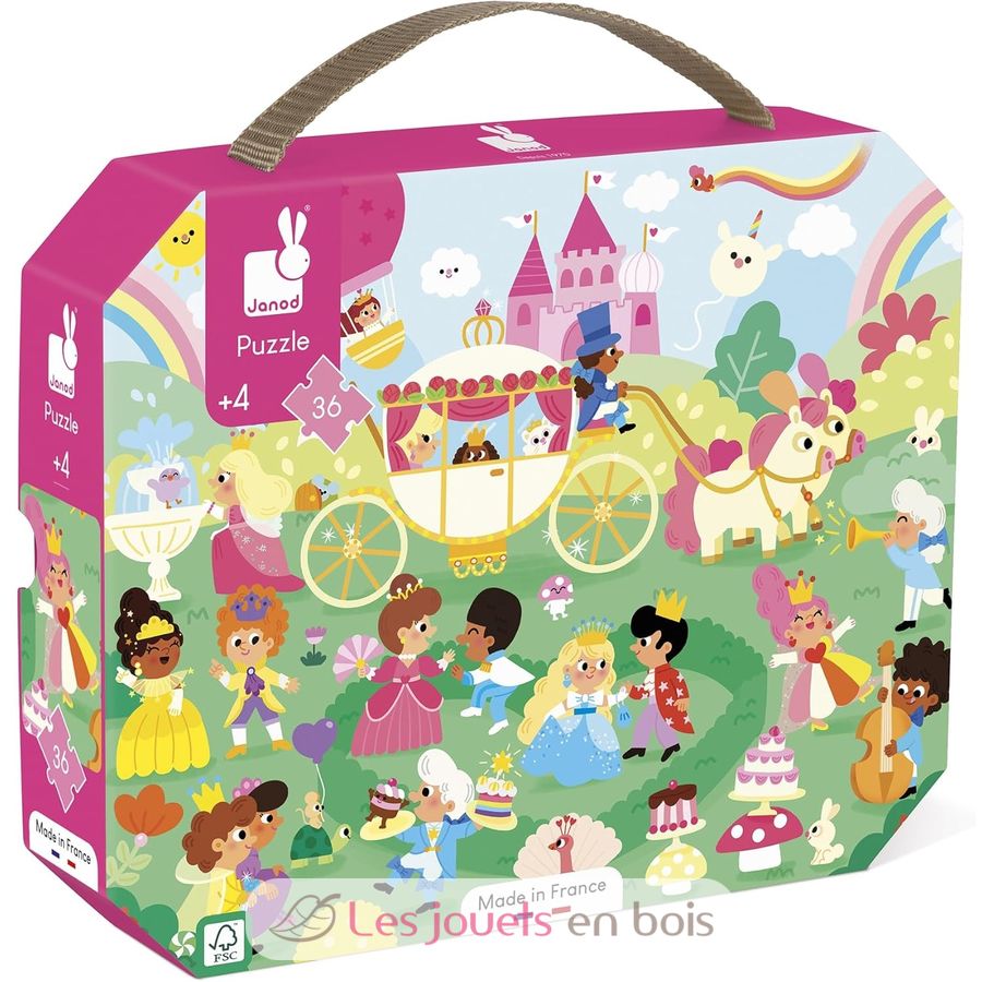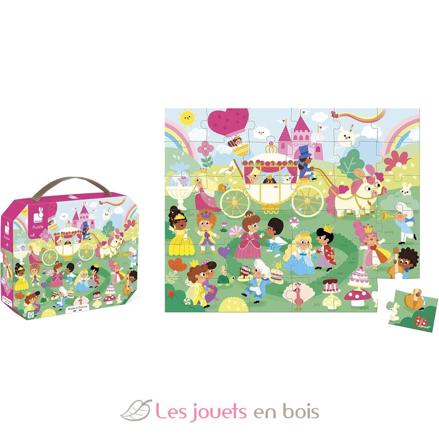 Pièce par pièce, les enfants de 4 ans et plus construisent ce puzzle en carton de 36 pièces au décor enchanté. Avec ce puzzle, l'enfant fait appel à son imagination pour créer une histoire et développe sa concentration. Il était une fois... une grande fête au royaume enchanté. Dans un univers plein de couleurs et de magie, le roi et la reine ont organisé un grand bal pour célébrer l’arrivée du printemps. Tous les invités du royaume sont conviés : princesses, princes, animaux... Mais qui est cette mystérieuse princesse à bord de son carrosse ? Peut-être une princesse surprise !