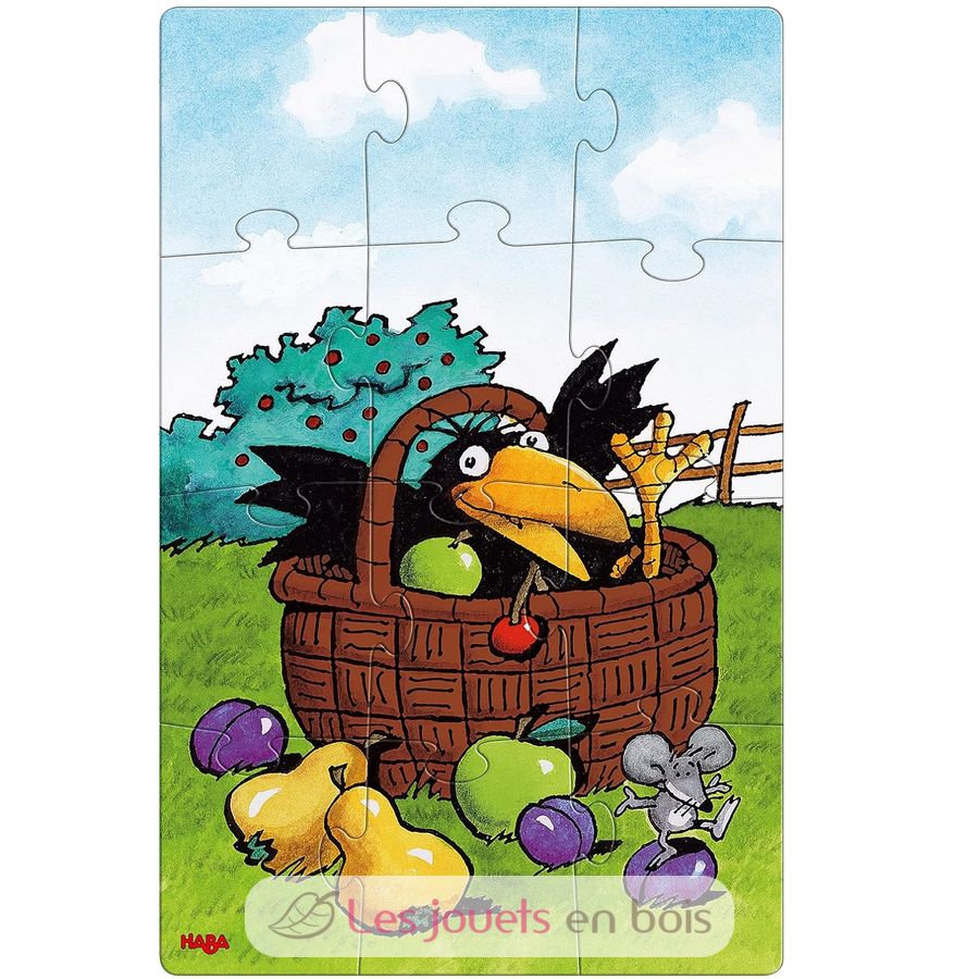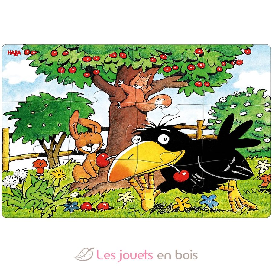 Voler des cerises, des poires, des pommes et des prunes juteuses dans le verger est particulièrement amusant pour Theo le corbeau. Ces puzzles pour enfant montrent le corbeau en train de faire son activité préférée : dans le premier puzzle, le corbeau Theo attrape une paire de délicieuses cerises ; dans l'autre, il est assis joyeusement dans un panier plein de fruits.